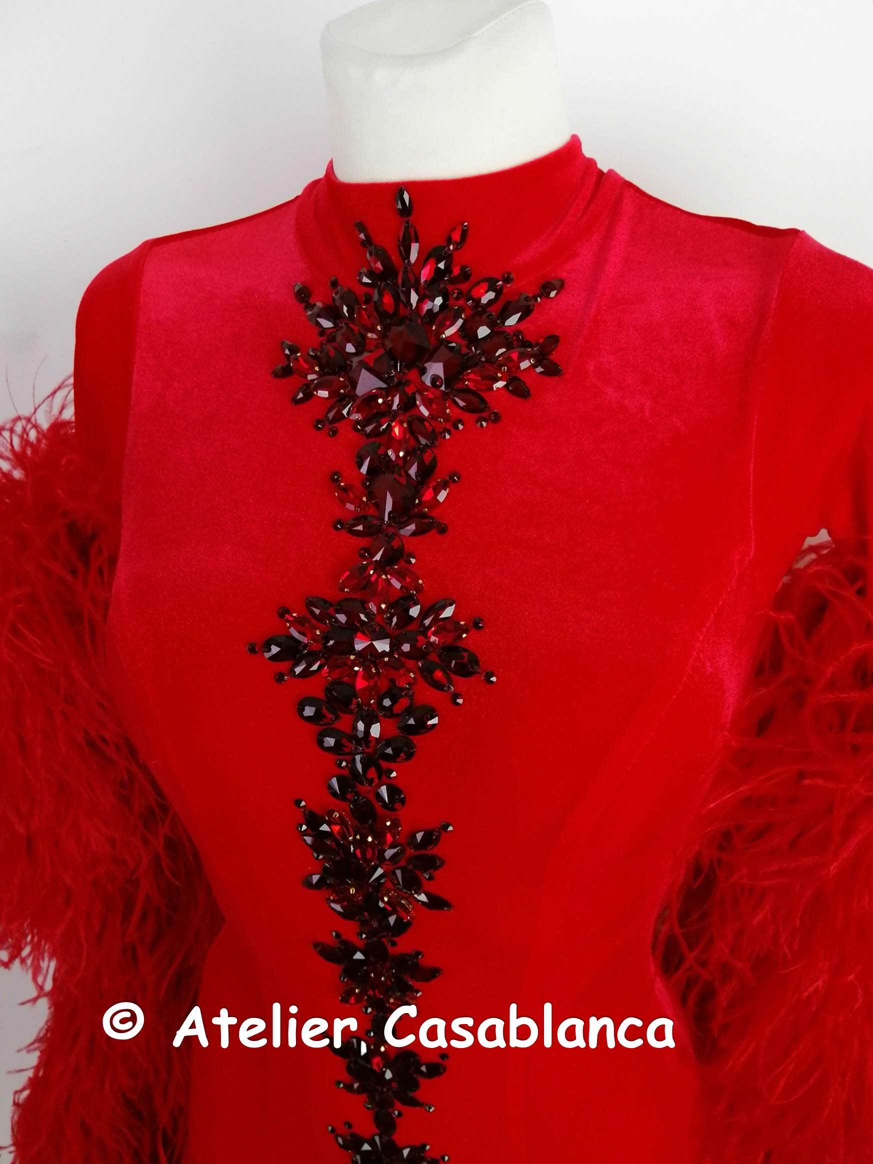 スタンドカラーで後ろにファスナーがあり、背中の開きがあまりないとてもエレガントな印象のドレスです。総ベルベット素材なのでラグジュアリーな質感が大変美しく、縦のラインを出すように大きな赤のプレチオサの石だけで作られた美しい装飾が大変スタイル良く足長に見せます。