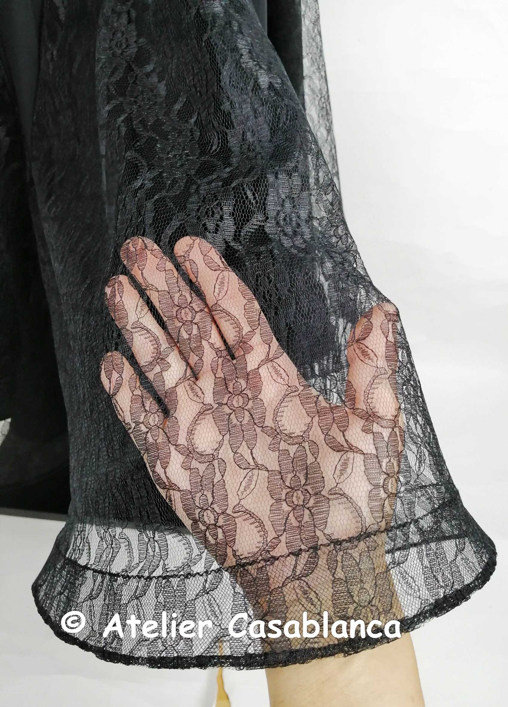 スカートは切り替えて裾が広がっている部分の布が二重になっており、レースを重ねているので大変ラグジュアリーで印象深い、大変素晴らしいデザインのスカートです。