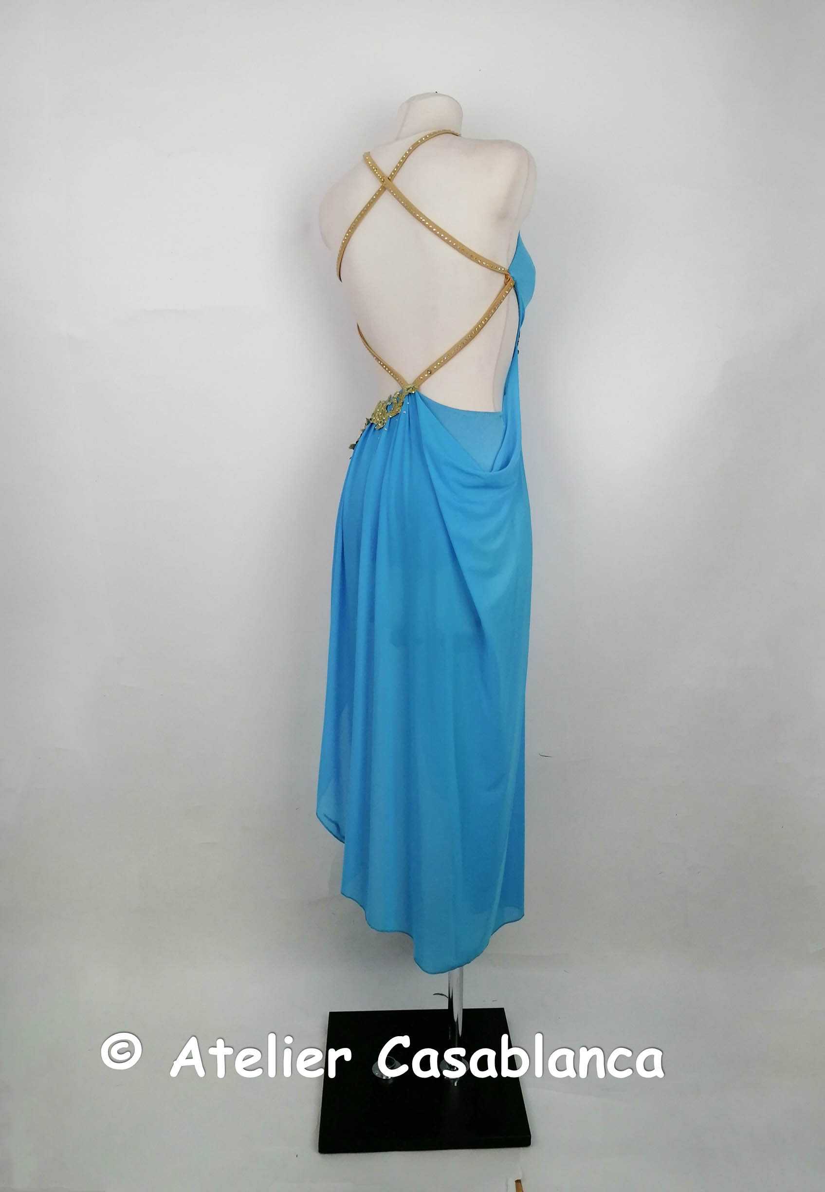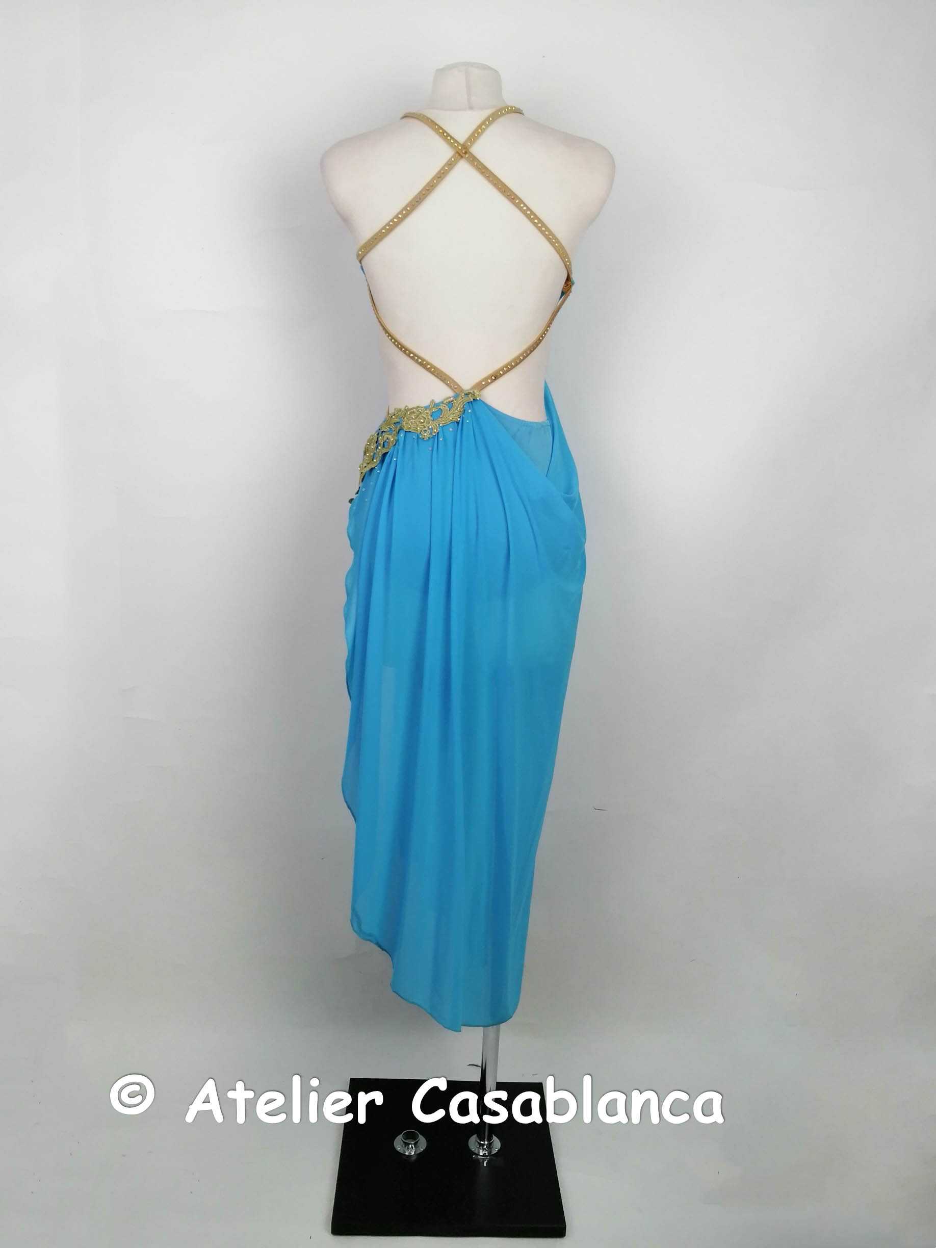 ワンショルダーでドレープ使いが大変美しい、ターコイズブルーとゴールドのレースモチーフのコントラストが美しいロングのルンバスタイルのラテンドレスです。