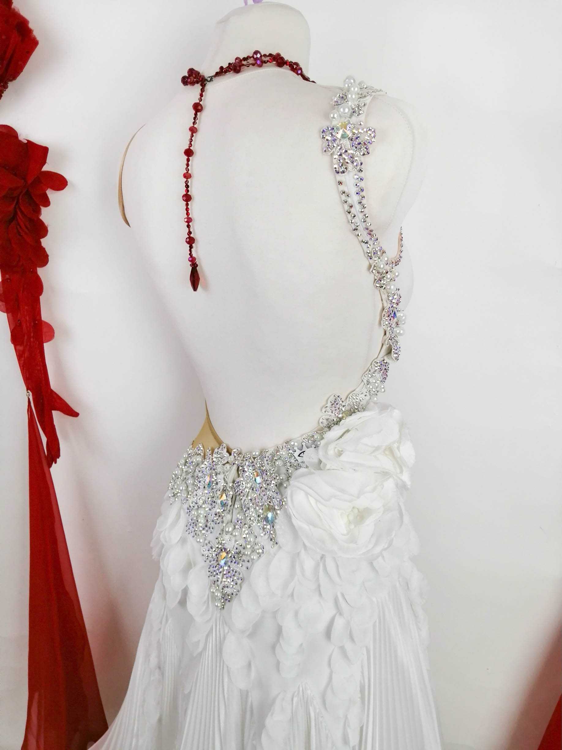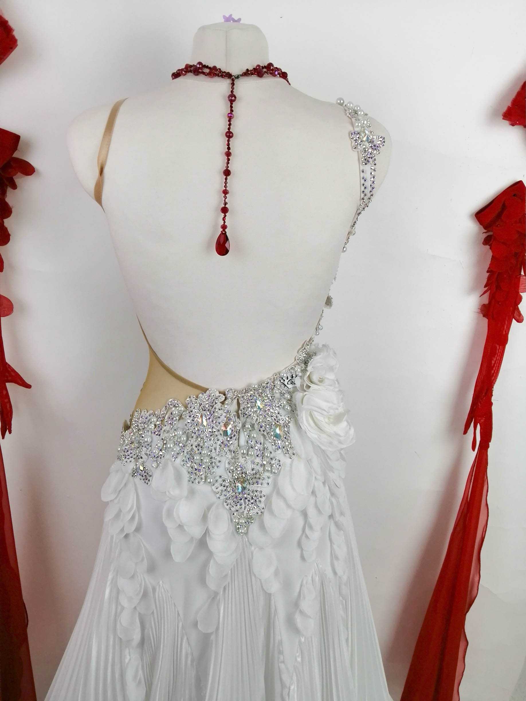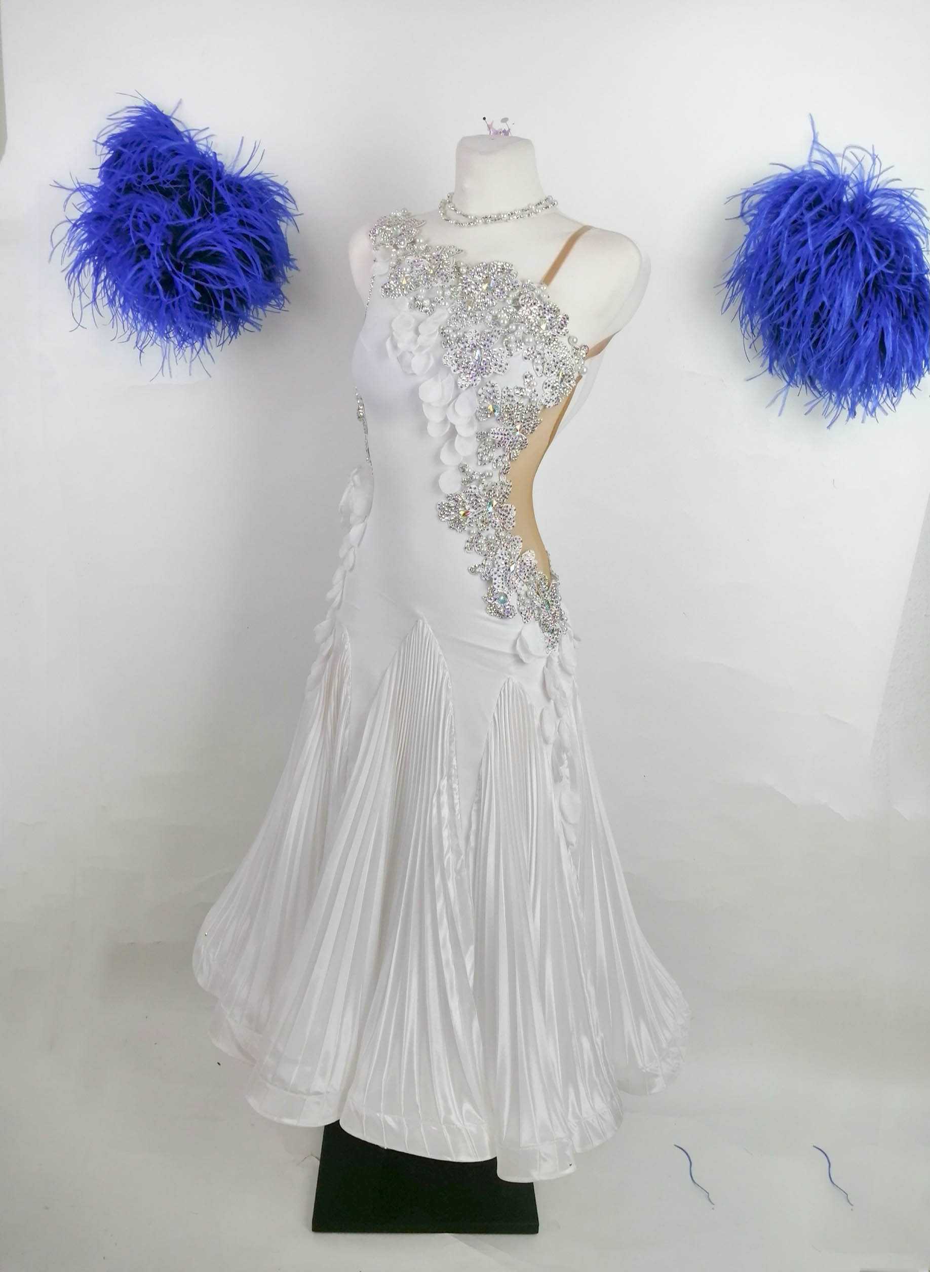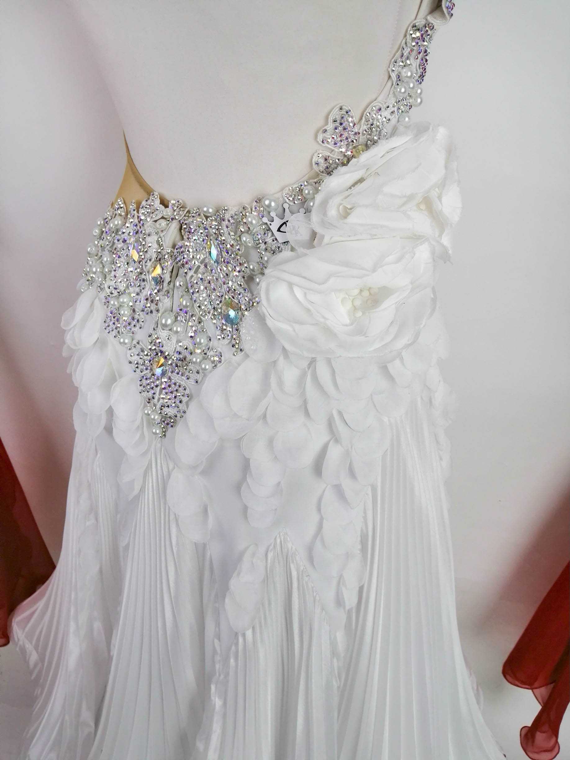 リトアニアの超ラグジュアリーブランドで、世界のトップクラスの選手の多くの絶大な支持を誇る「DLK」がリトアニアのユース選手のために制作した、ワンショルダーの石びっしり、ハンドメイドの花びらのオーナメントとプリーツ加工されたスカートが超美しい白のスタンダードドレスです。