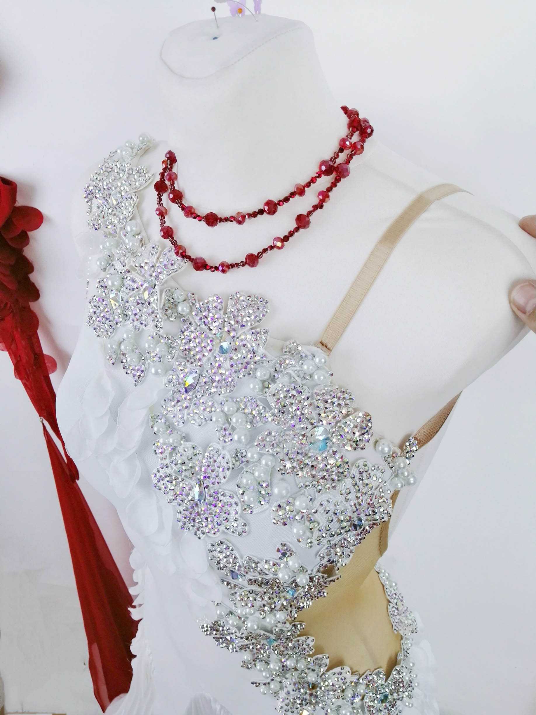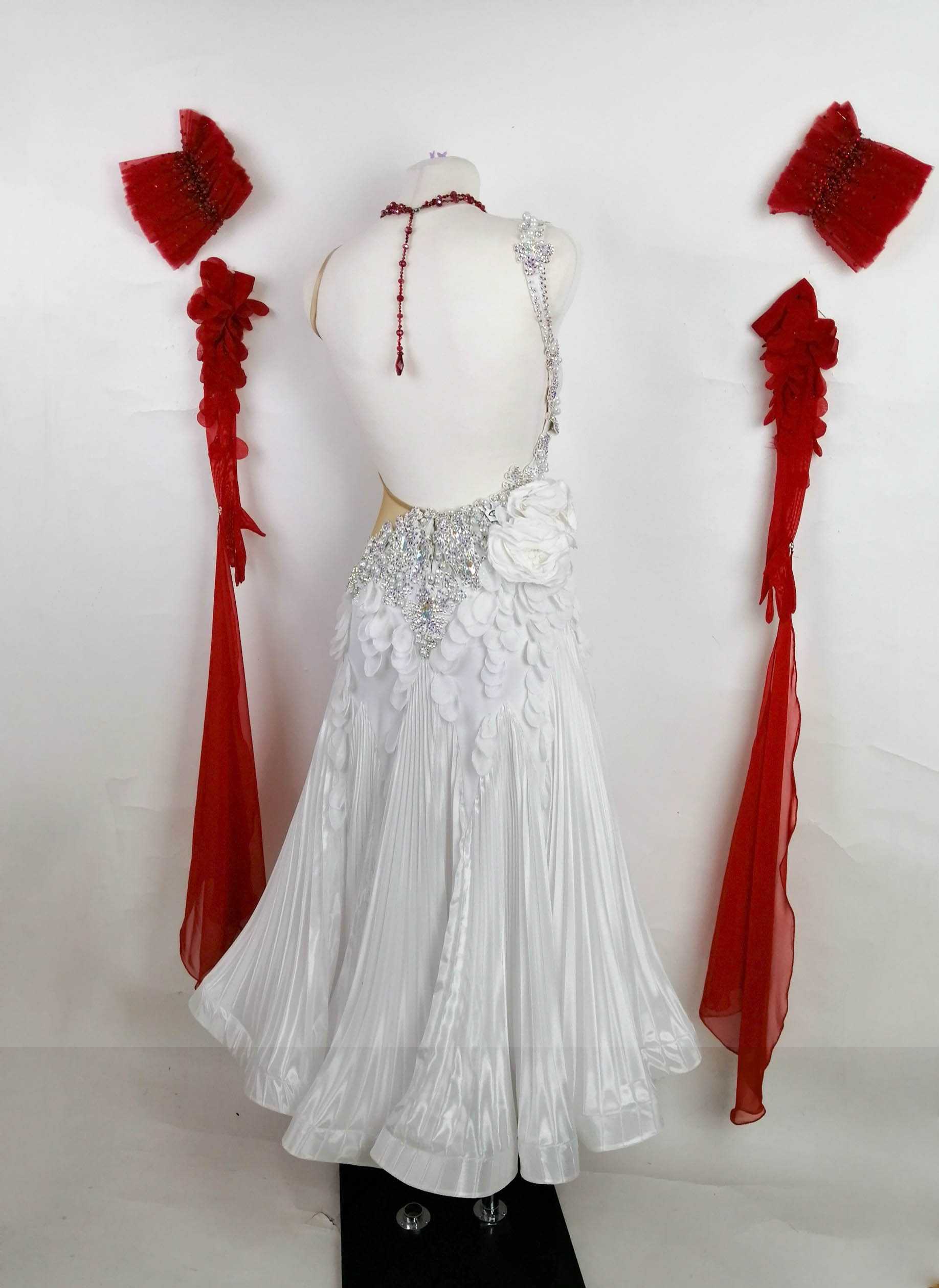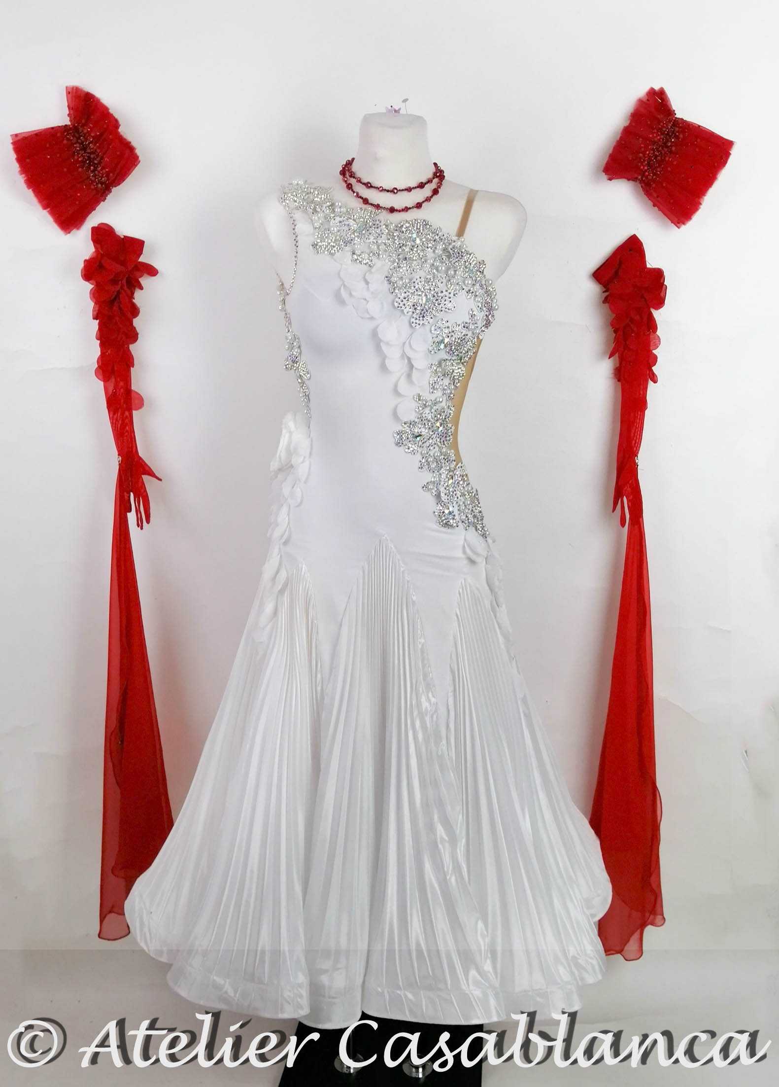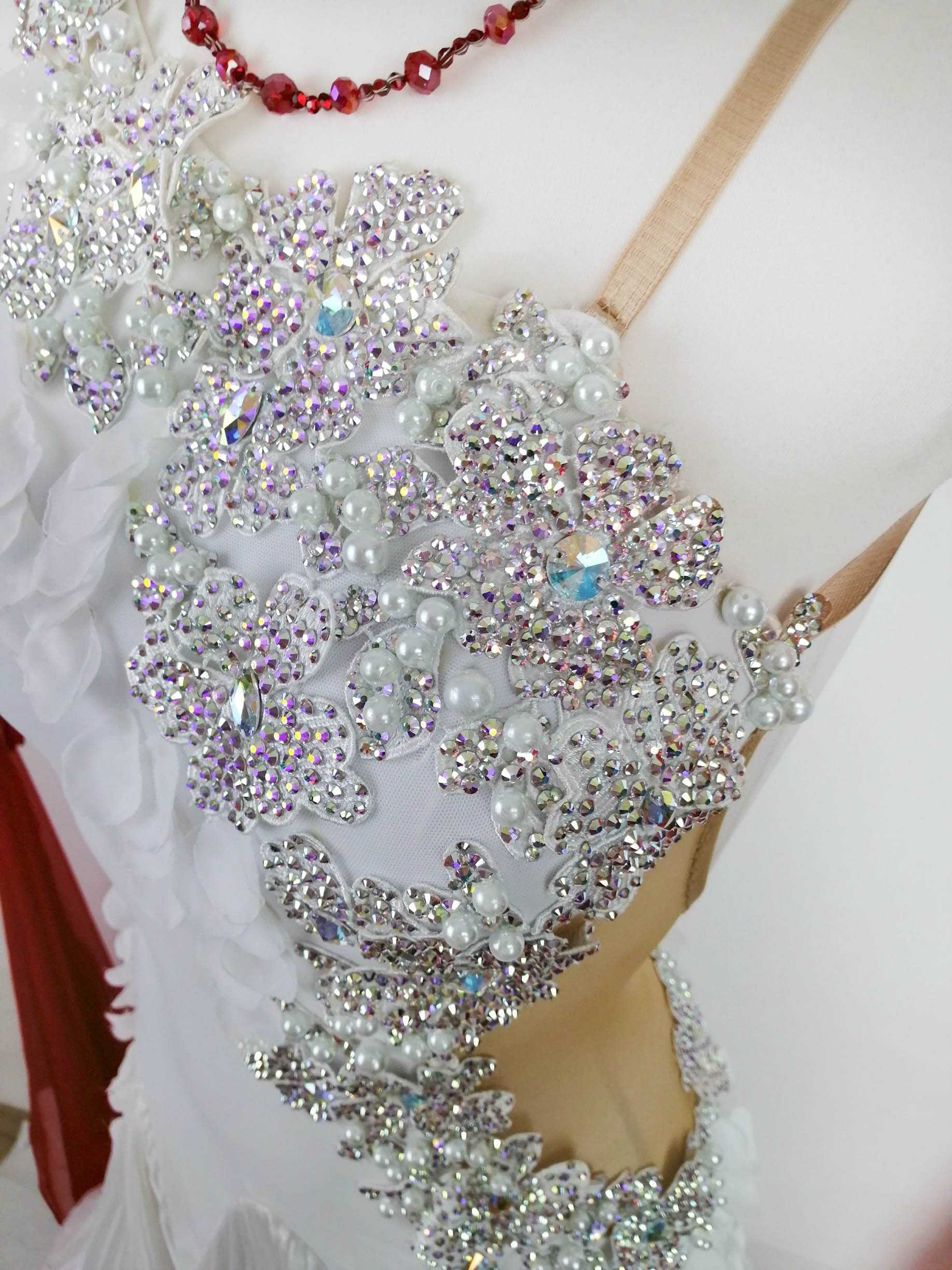 リトアニアの超ラグジュアリーブランドで、世界のトップクラスの選手の多くの絶大な支持を誇る「DLK」がリトアニアのユース選手のために制作した、ワンショルダーの石びっしり、ハンドメイドの花びらのオーナメントとプリーツ加工されたスカートが超美しい白のスタンダードドレスです。