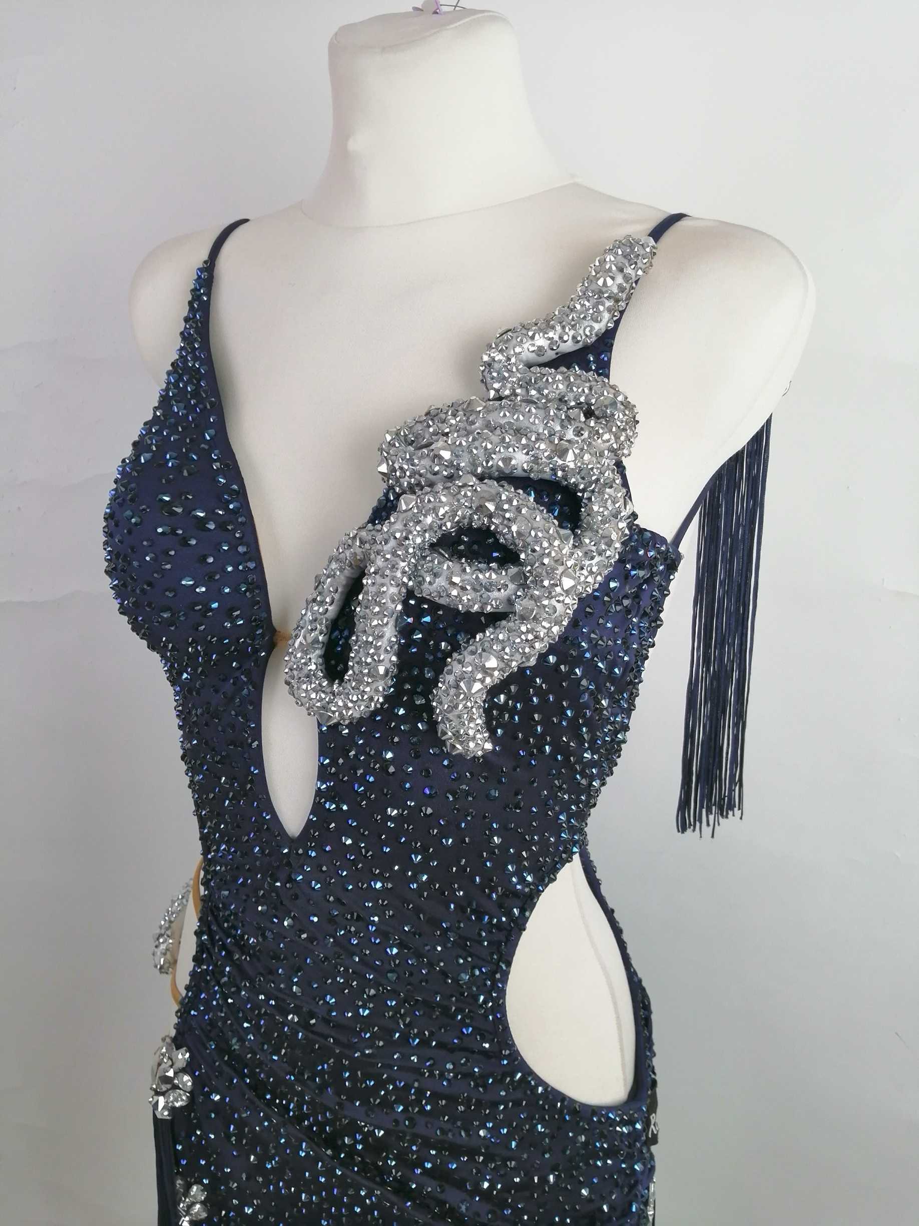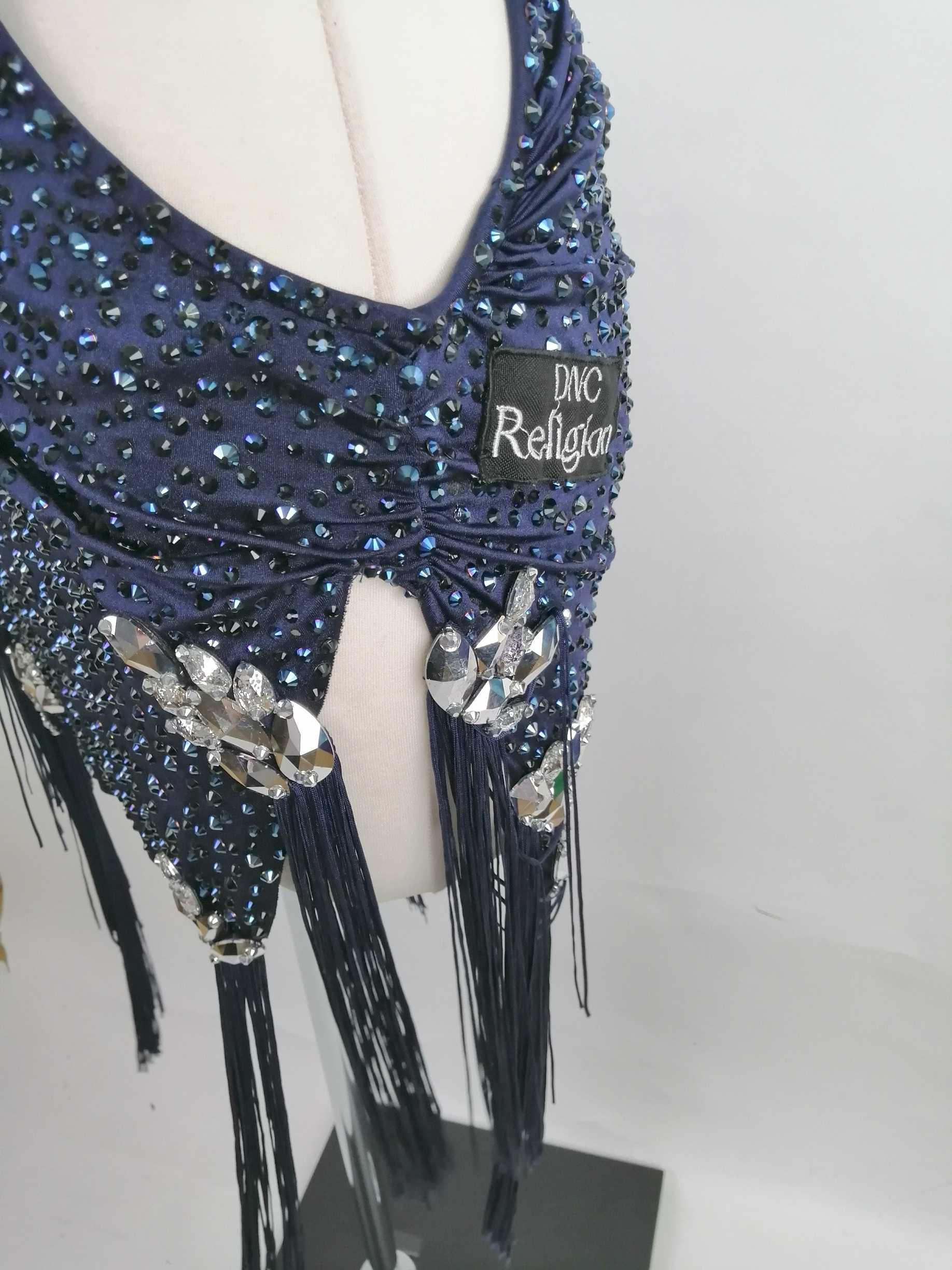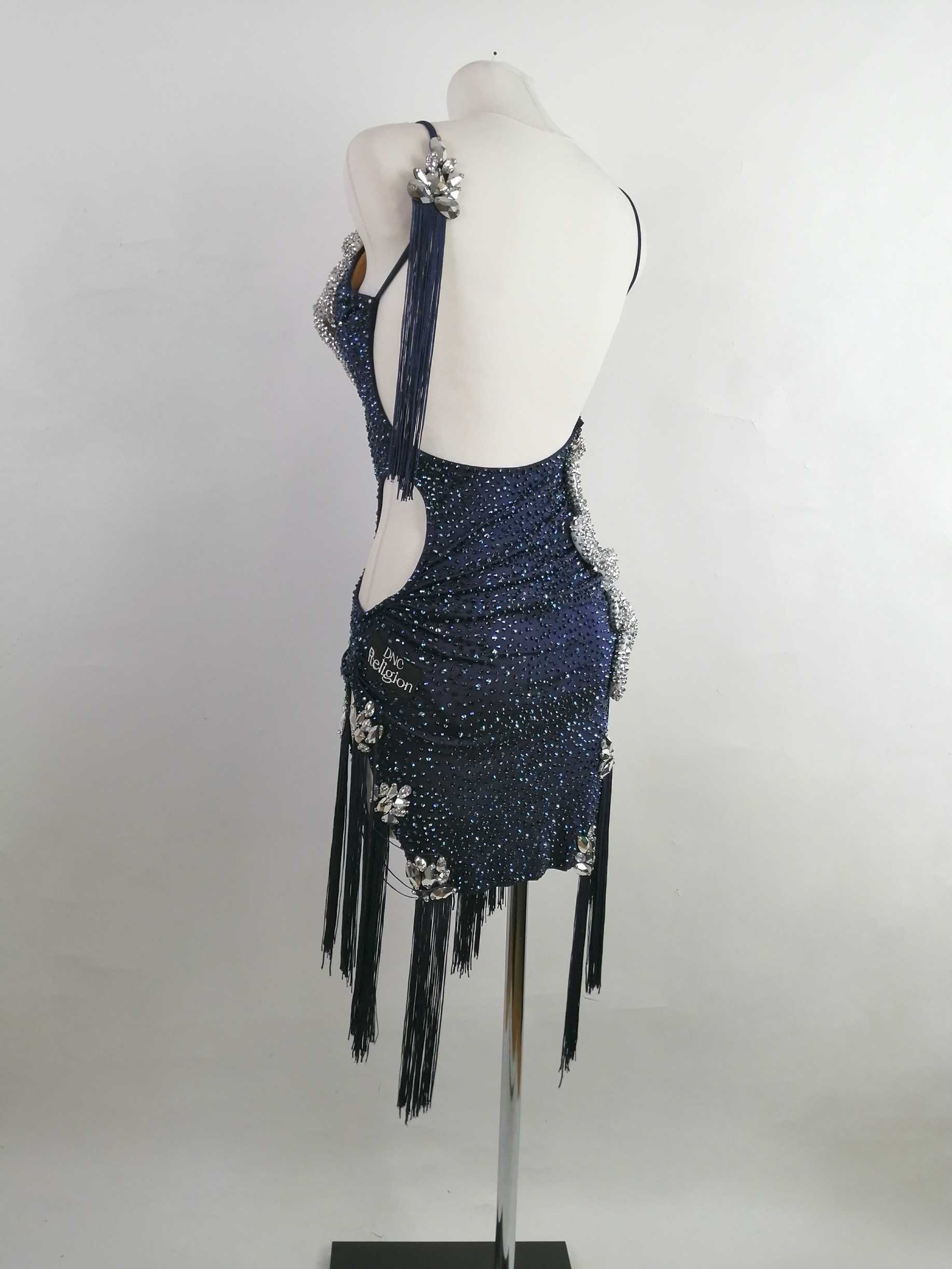 ウクライナのラテンチャンピオンのタイトルと世界選手権ファイナリストのタイトルを持ち、UK戦やロンドンインター、ブラックプールなどのビッグコンペで常に上位にいる大変すばらしいラテンダンサー、ヴィクトリア・マイスター選手のためにウクライナのダンスドレスブランド、「DNC」が制作した、全身石ぎっしりの超かっこいいネイビー&シルバーのラテンドレスです。