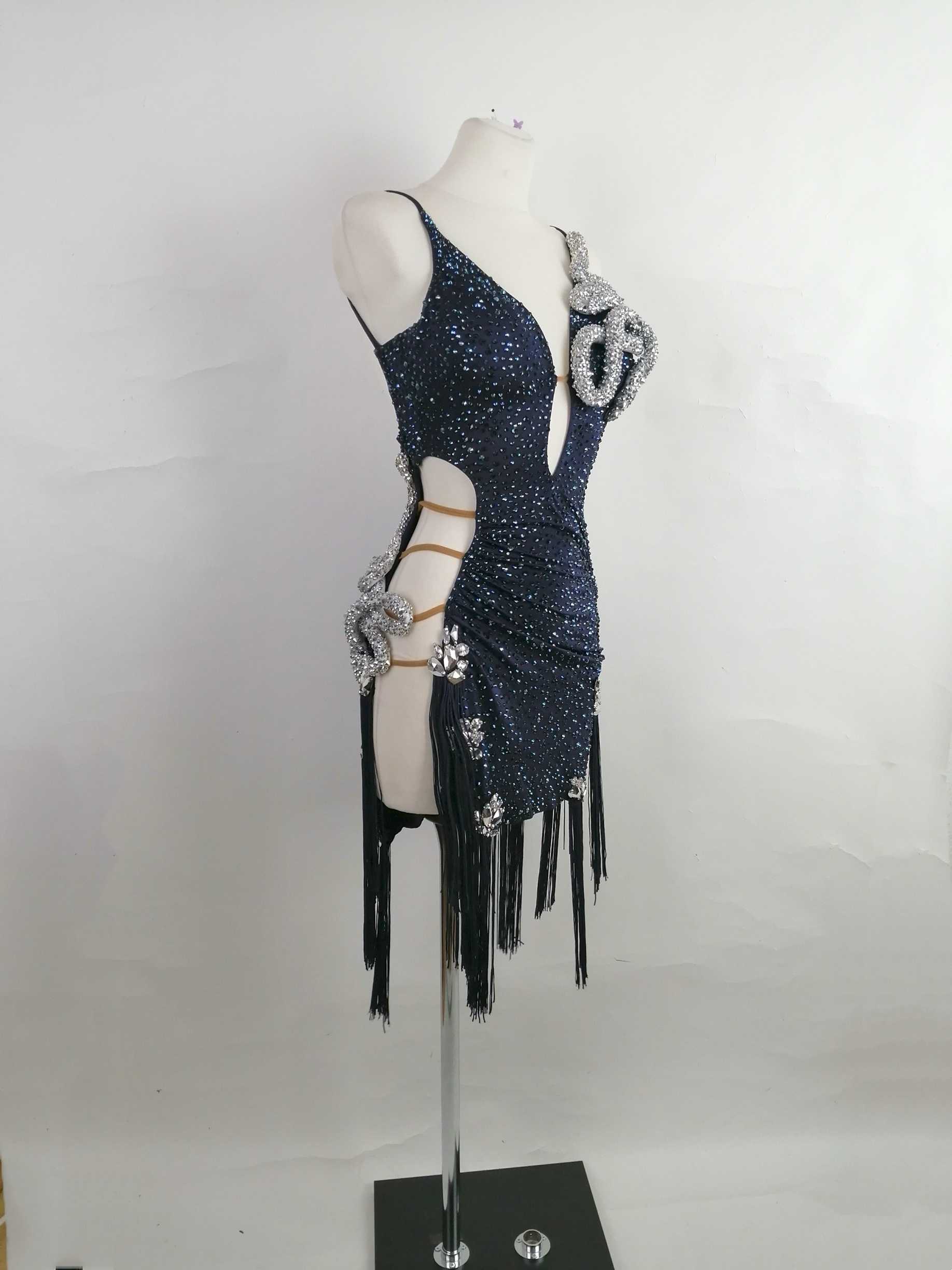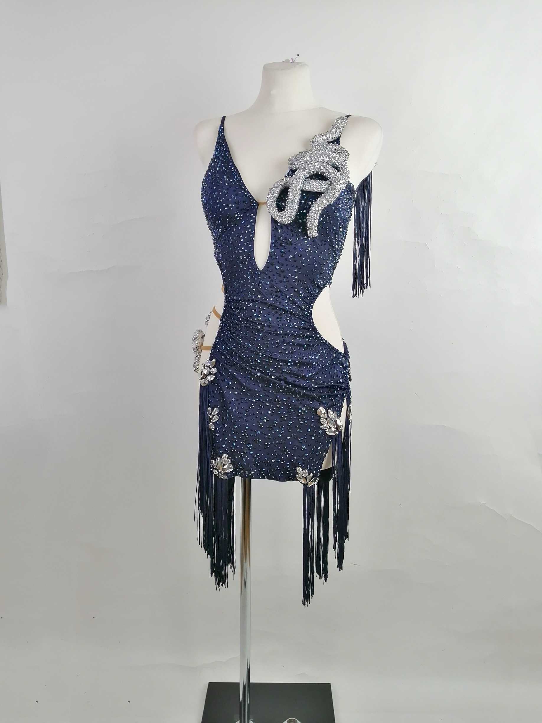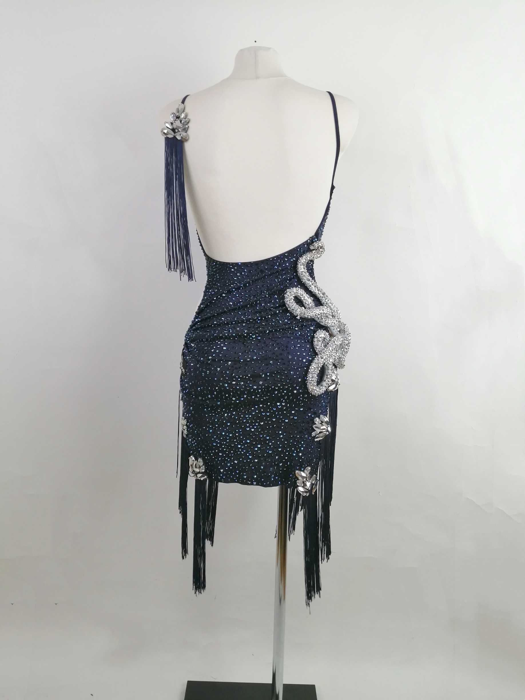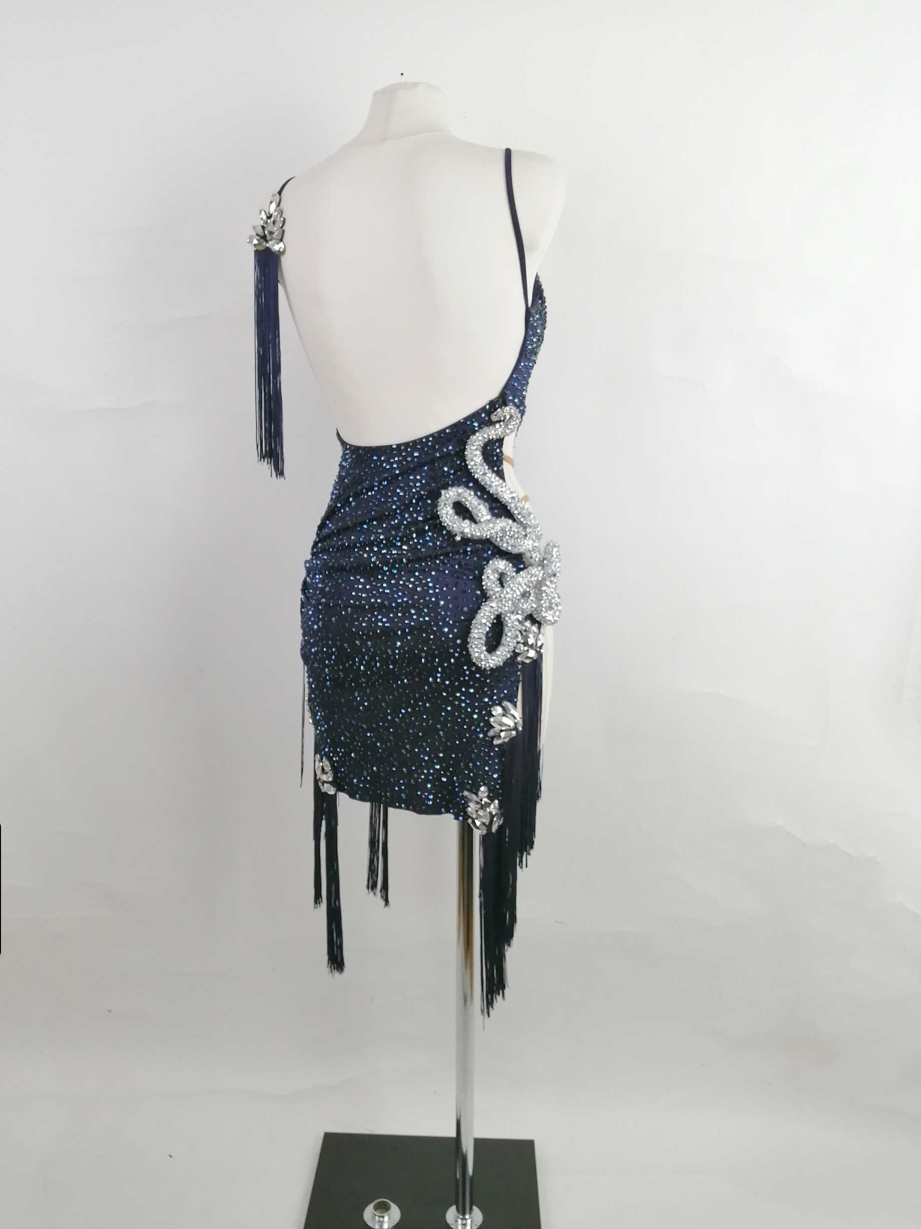 ウクライナのラテンチャンピオンのタイトルと世界選手権ファイナリストのタイトルを持ち、UK戦やロンドンインター、ブラックプールなどのビッグコンペで常に上位にいる大変すばらしいラテンダンサー、ヴィクトリア・マイスター選手のためにウクライナのダンスドレスブランド、「DNC」が制作した、全身石ぎっしりの超かっこいいネイビー&シルバーのラテンドレスです。