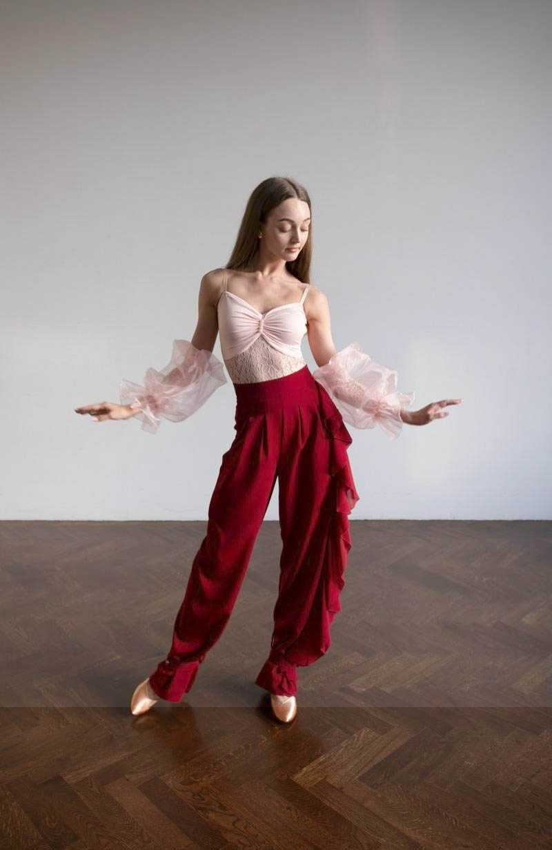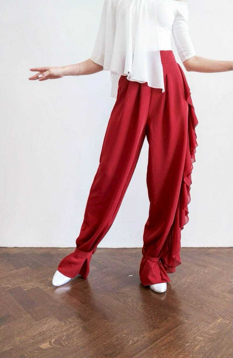 ロシアの素晴らしいラグジュアリーダンスウェアブランドで、管理人自身も超絶愛用しまくりの超!お勧めの「プラクシス」が制作した、左サイドのロングのフリルのデザインが超美しいスタイルよく見える落ち着いたクラシカルな赤のワイドパンツです。