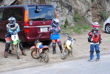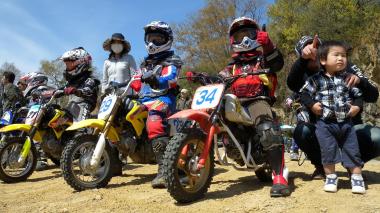 3/29(月) プラザ阪下(河内長野市)にオフロードの練習に行ってきました。 春休み中なので今回は子供達が主役。 とにかくテンション上がりっぱなしで、とても賑やかな1日でした。 平日という事もありコースは空いていて走りやすかったのですが ・・・寒い!!! 季節外れの雪が降るほどの寒さに、走っているチビッコ達はともかく見てるコッチは ガクガク、ブルブル・・・。 寒さに負けてテンション低~い大人達を横目に元気一杯走りまくるライダー達。 「休憩しろよ~。」「うん、分かってる~!」・・・で小一時間程走りっぱなし。 どんだけ元気やねん。 ついこの間までまっすぐ走るのもおぼつかない位だったのが、あっという間にこの通り。 子供の吸収力や成長スピードはスゴイです。 ジャンプも難なくこなします。 たまにはこんな事もご愛嬌で。 逞しいものでコケてもすぐに起き上がって走り出します。 「痛ぁい!お母さぁん!!」と泣いていたのは昔の話。男ですねぇ! 「まだ~?」「チョットまってね。」「はやく乗りたい~!」 1日楽しくバイクで遊んで満足してくれた様子。 帰りの車ではスヤスヤ・・・。お疲れ様でした。楽しかった? 「また行きた~い!」「連れてって~!」と催促されたので次回も行かないワケには いきません。 さて次は何時頃にしようかな? GW? 夏休み? それまで楽しみに待っててネ!
