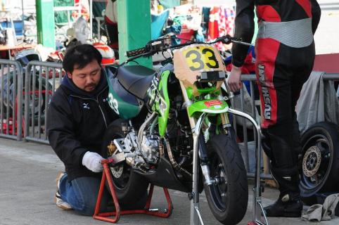 皆さんこんにちは 桜も散り気温も下がるワケワカラン気候ですねぇ~ さてさて今回は4月4日に参戦してきました「猪名川4時間耐久レース」のレポです 天気は問題ナシの晴れ 良い天気でレースとなればテンションも上がりMAX(朝は寒かったそうデス・・・) 今回のマシンはKSR 110 ライダーは・・・ バイクの構造あんまり分からないけど勢いでイキマス「二~ニョ君」 キレイなフォームで駆け抜ける、最近転倒が減ってきた「先生」 勢いと気合と根性の走りで見るものに期待を抱かせる「サンダーさん」 メカは・・・KSRも任せな!クマ店員 で参戦デス 期待のもてるメンツで朝6時に猪名川サーキットに乗り込みだ さて、まずは朝一のフリー走行(練習走行)・・・ 一番手は、熱い走りと、ベストタイムをたたき出すスピードで見るもの引き込むサンダーさんからコースイン 一周目が終わり、さぁペースアップ ・・・ヘアピンで転倒だぁ~~ ピットインしてチェック・・・幸い怪我もナシ。バイクもペダル曲がり位でスグ修正完了 ピットアウト・・・ 熱い走りでんなぁ~ 次にレース歴は浅いもののセンスでメキメキと速さを増している二~ニョ君へ交代 久しぶりのレースということもあってか、探り探りの走行。コースとバイクに慣熟の為の走行となった・・・ そしてキレイなフォームで安定感を増してきた先生へ交代 さすが先生なかなかなタイムで走行 ここでフリー走行終了 ここまでのベストタイムは先生 そして予選 あえて予選順位は重視せずに、走行時間の少なかったサンダーさんにチョット多めに走ってもらって、その後、決勝用タイヤに交換してタイヤの皮むき兼最終チェックの作戦・・・ ところが・・・始まってビックリ 走り始めたサンダーさん・・・フリー走行の先生のタイムを上回る快走スゲ~ぜサンダーさん ピットインしてタイヤ交換後しっかりタイヤの皮むきして・・・ 予選終了・・・ 結果は・・・7位(22台中) スゲ~ぜ決勝が楽しみぢゃ バイクのチェックして・・・決勝の交代プラン決めて・・・ てことで・・・イザ決勝スタート ゼッケン33はどこかいな・・・ おっえ~位置付けとる そのまま予選順位をキープして1周目クリア フリー走行、予選と乗り切れていない感じだった二~ニョ君・・・ それが夢だったかのような快走でなんと4番手に浮上 カッコえ~ぞ そのまま快走を続ける あと5分位で交代となった70分経過あたり・・・ アクシデント発生 「チェーン外れたみたいに、進まなくなった」 と、緊急ピットイン すぐさまクマ店員がバイクをチェック シフトペダルの動きがおかしい・・・ スグにバイクを寝かせて、カバーを開けて内部チェック シフトのシャフトがずれている・・・ でも・・・これだけか・・・? との不安を抱えつつ一旦カバーを閉じてキックにてエンジン始動を試みるも・・・ キックも降りず・・・シフトの動きも変わらず・・・ 再びカバーを開け・・・シャフトを外したり・・・各部のチェックを行なうも・・・ 改善せず これはもうエンジン内部の損傷だろうと判断し 無念のリタイアと決めました メカがバイクをつくり、チェックし、ライダーが頑張ってタイム削って・・・ 結果がついてくるというのが目標ですが・・・ なにぶんレース どんな事が起きるのか分かりません 起きたことに現場で対応できることもあれば、逆もしかり・・・ 残念な結果となりましたがこれもレース 次回への教訓として学ぶ機会だったと捉えます。 とはいえ・・・やはり悔しい・・・ クマ店員の寂しげな背中・・・ クマ店員曰く「ヨソのチームのバイクの偵察じゃ」とのこと というわけで残念な結果の「いな耐」となりました。 お手伝い頂いた方々、応援していただいた方々、ありがとうございました メカとしては今回の結果を次への教訓としてまたバイク作っていきますので次回も よろしくお願いします おまけ・・・ 今回の癒しショット でかくなったらレース出るのかなぁ~ では