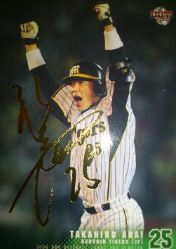 今回もまた、到着カードを紹介します。その前に、西武対ヤクルト戦今日の西武の負けは痛かったです。9回裏2死ランナーなしから連打で同点・・・あと一人になったので気が抜けてしまったのでしょうかですが、マイコレ選手の熊代選手は打率5割といい働きしてますこの調子でスタメン定着してほしいのですが、秋山選手みたいに最初だけという感じになってしまうのか、それとも牧田選手のように安定感がでてくるのか、ここからが見所です。ぜひ頑張ってもらいたいです。話は戻りまして到着カードです。082nd:新井 貴浩 金箔サイン(/100)*提供可できれば11西武岸or熊代金箔、青箔絡みでの交換希望ですが、希望外でも検討いたします。明日も、到着カード(直筆サイン)の紹介予定です。