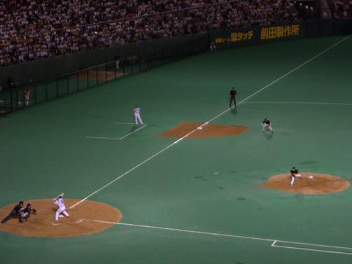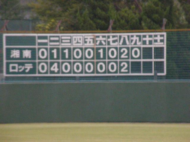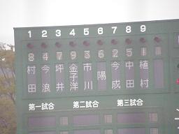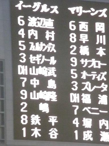 スタメン(見づらくてすみません)昨日はマリンへ。先発は木谷vs成瀬。正直、木谷か~折角の1軍。他の投手が観たかったなぁと思いました。それが災いしたのか1裏に即炎上。1回で試合がどっちかに大きく傾くのは観戦する上で嫌なパターンですね。木谷は2回で降板しそこからは大矢顔負けのマシンガン継投の楽天。客席からも「また交代かよー」というような声が多数。この展開では当然ロッテのペース。成瀬は木谷と正反対に7回?まで1安打投球。久しぶりに成瀬がいい投球をしました。楽天は7回にリックの犠飛で1点取るのが精一杯。結局1-4でロッテが勝利。スコアー内村 2番セカンド 1打数 1三振高須 内村と途中交代 2打数 無安打 画像は2打席目のサードゴロ。大塚が良く捕った。