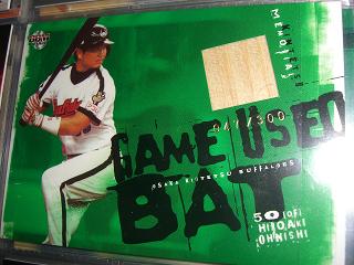 04近鉄 メモリアル 大西バット普段は横浜の選手でも横浜以外のカードは希望しないのですが、入手。大西のメモラが有ると最近知って、無性に欲しくなったので。他のメモラも他球団でも所持済み以外は消極ですが希望ですのでご依頼お願いします。