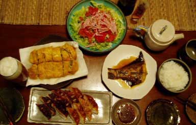 昨日のメニューは。春巻き。野菜サラダ。カレイの煮付け。