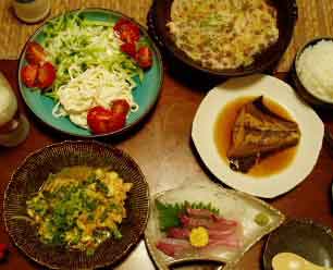 昨日のメニューは。長いものお好み風。サラダ。豆腐ちゃんぷる。水カレイの煮付け。いさぎのお造り。。。