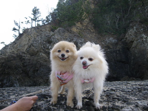 ちょっと不調だった私ちょっとじゃないか・・・2日もごはん食べられんかったもんね・・・でもすっかり治ったので志摩へGO 悪ガキども お利口ちゃん達の奇跡の仲良しショットやる気まんまんのラピぴょんぴょん走り波打ち際もへっちゃらうれちいね~一方こちらのお兄さんじゃなくってカワイコちゃんきょわいきょわい~と踏ん張り浜辺へ降りようとしない怖がりアズ海や滝のそばなど必要以上に怖がる傾向にある 大丈夫何にも怖くないよあんなビビりなラピが走ってるでしょ 「アズぅ 早よ 来んかいっ」ラピ姉さんの教育的指導入りました