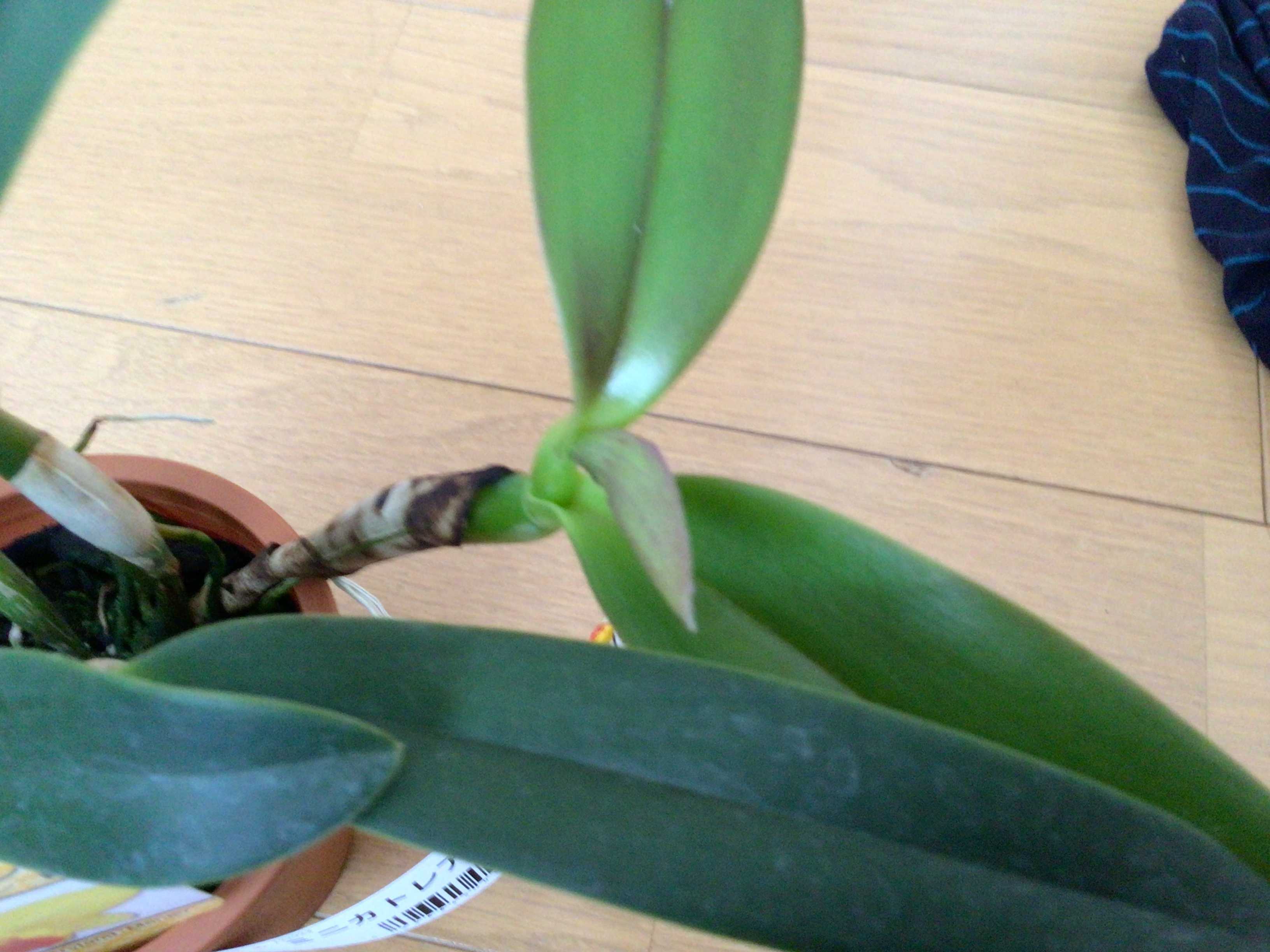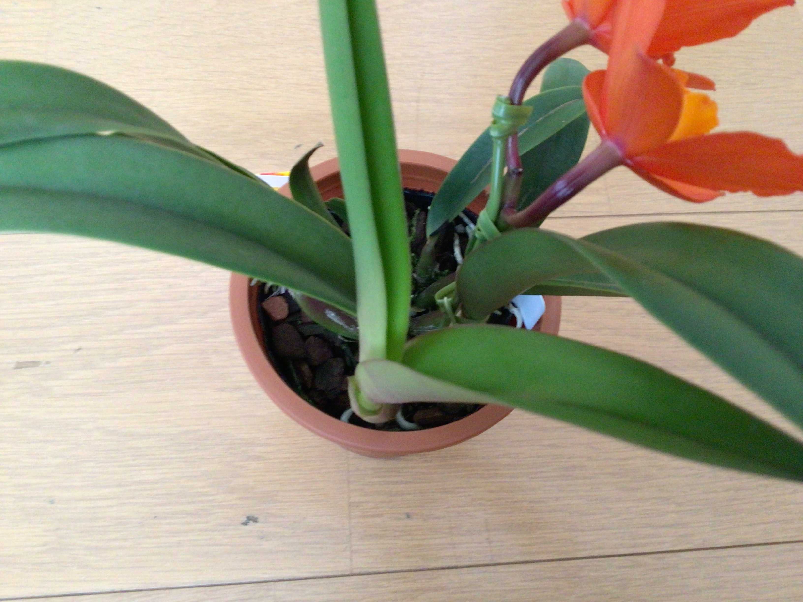 花の咲いているバルブの後ろに新しいバルブがあってそのバルブに花芽があります。