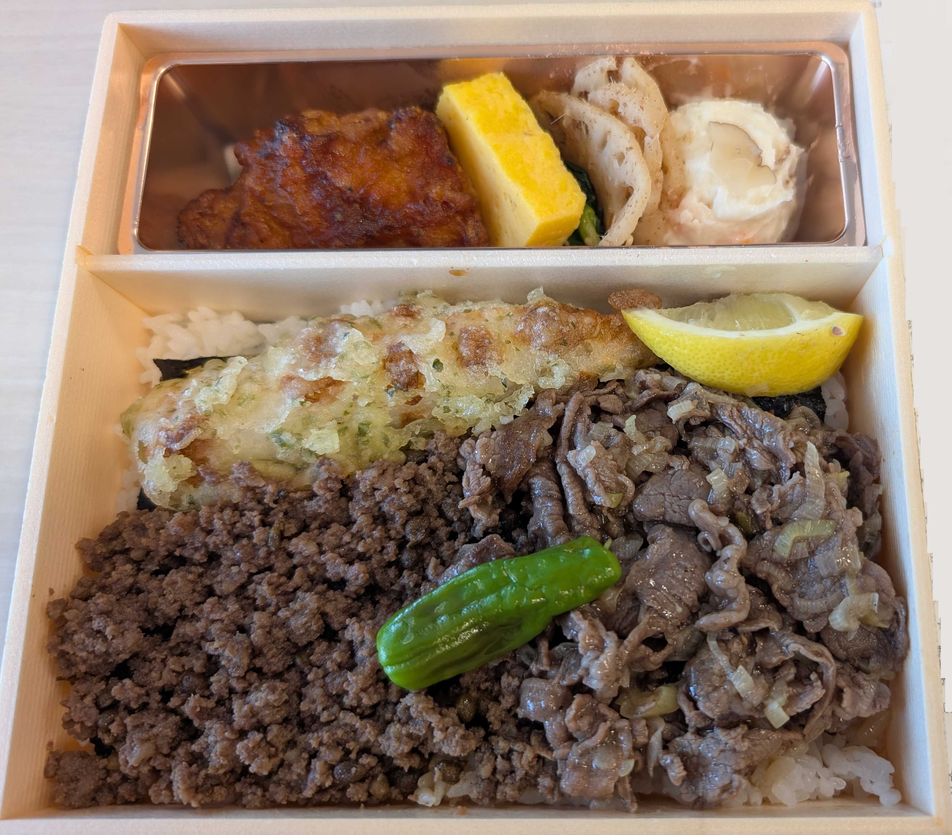 のり弁、お弁当メインのお店です。期間限定の、黒毛和牛の弁当を選択しました。肉は、牛そぼろ山椒焼き、牛カルビ葱塩焼きの2種類です。牛そぼろは、山椒のぴりっとした刺激が心地よく、かといって山椒味になっていない、強すぎない味付けです。これは、ご飯を食べ進めて、脂を山椒が切ってくれるので、非常に食べやすかったです。牛カルビは、脂がやはり気になります。葱塩ダレがかかっていることによって、脂がさらに追加されてしまったことで、ごはんが油でテロテロに。カルビの脂だけで、葱を乗せるくらいでよかったと思います。付け合わせで気になった点は、フライドチキンがついていることです。これは、ごはんに合わないので、唐揚げだったらなぁと思いました。野菜はほとんどありません。総評としては、牛そぼろは良かったですが残りがあんまりよくはなかったかなぁという印象です。しかし、海苔が簡単に切れたので、ここはプラスポイントです。1300円はちょっと高いかな。見た目 :★★★☆☆おかずの大きさ:★★★★☆おかずの数 :★★★★☆ボリューム :★★★★★味 :★★★☆☆お値段 :★★★☆☆ (1300円)総合評価 :22点/30点