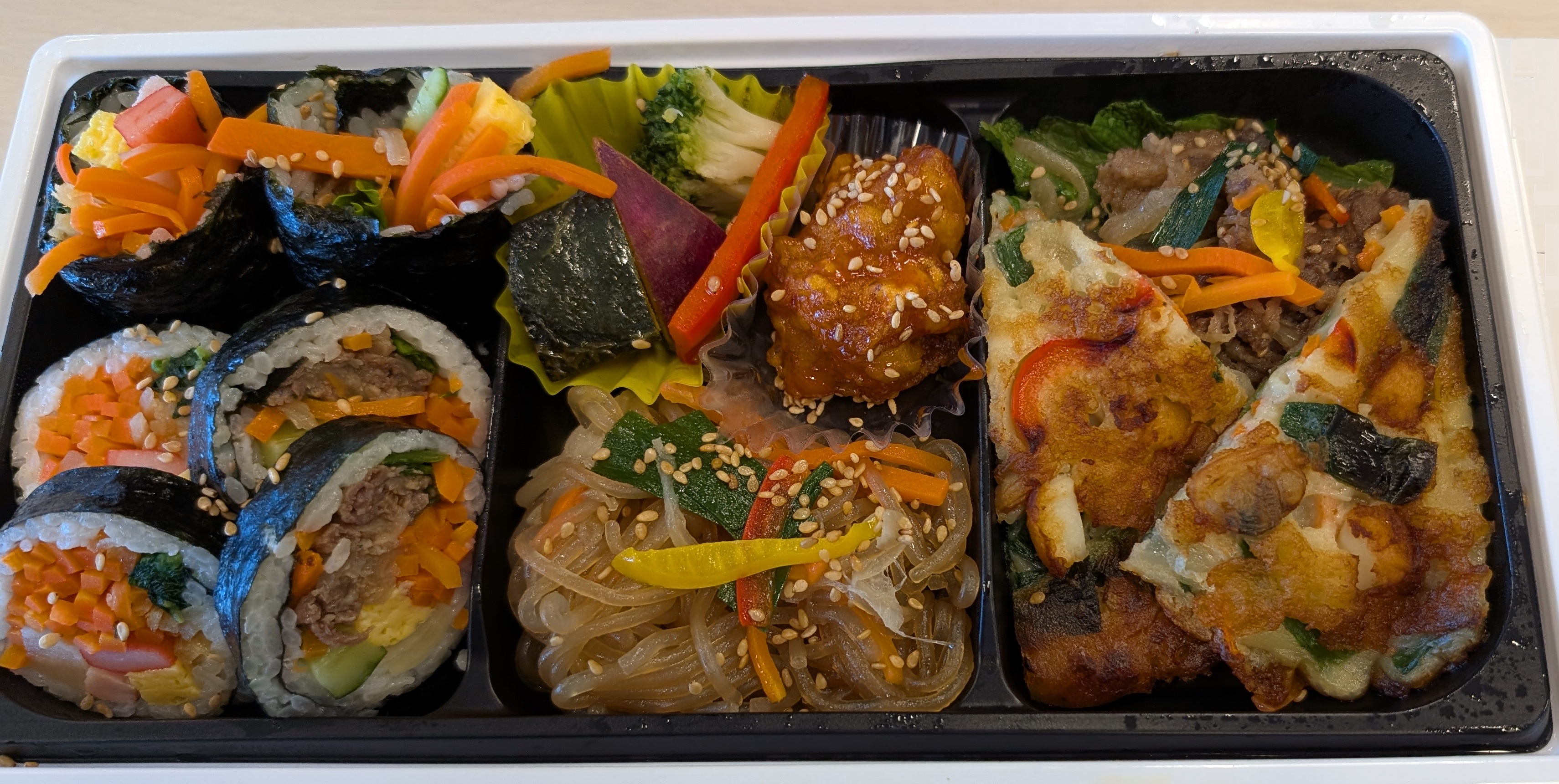 キンパがメインの韓国お惣菜屋さんです。今回は彩り善を選択しました。その名の通り、彩が素晴らしいです。本当に華やかで、ニンジンのオレンジがあると、目を引きます。おかずの種類も多く、キンパ、チヂミ、チャプチェ、ヤンニョムチキン、焼肉など一通りの韓国料理が楽しめます。キンパはニンジンなどの野菜と味付きかまぼこが入っています。かなり野菜豊富で、ポリポリとした触感です。私の中ではキンパ≒ごま油海苔巻きのイメージですが、ほとんど脂っこくなく、野菜たっぷりおにぎりに近いです。チジミは、イカとあさりが入っており、触感と味のアクセントになります。強いてあげると、酢醤油が欲しかったかな。。味の主張はあまり強くありません。全体的に、味は薄味で、野菜や肉の味がしっかりと感じられます。野菜がかなり多く、約1/3は野菜といっても過言ではないかと思います。量は十分、おなかが満たされます。薄味すぎる点が少し足を引っ張り、もう少し塩味が効いているほうがおいしいと感じました。見た目 :★★★★★おかずの大きさ:★★★★★おかずの数 :★★★★★ボリューム :★★★★☆味 :★★★☆☆お値段 :★★★★☆ (1080円)総合評価 :26点/30点