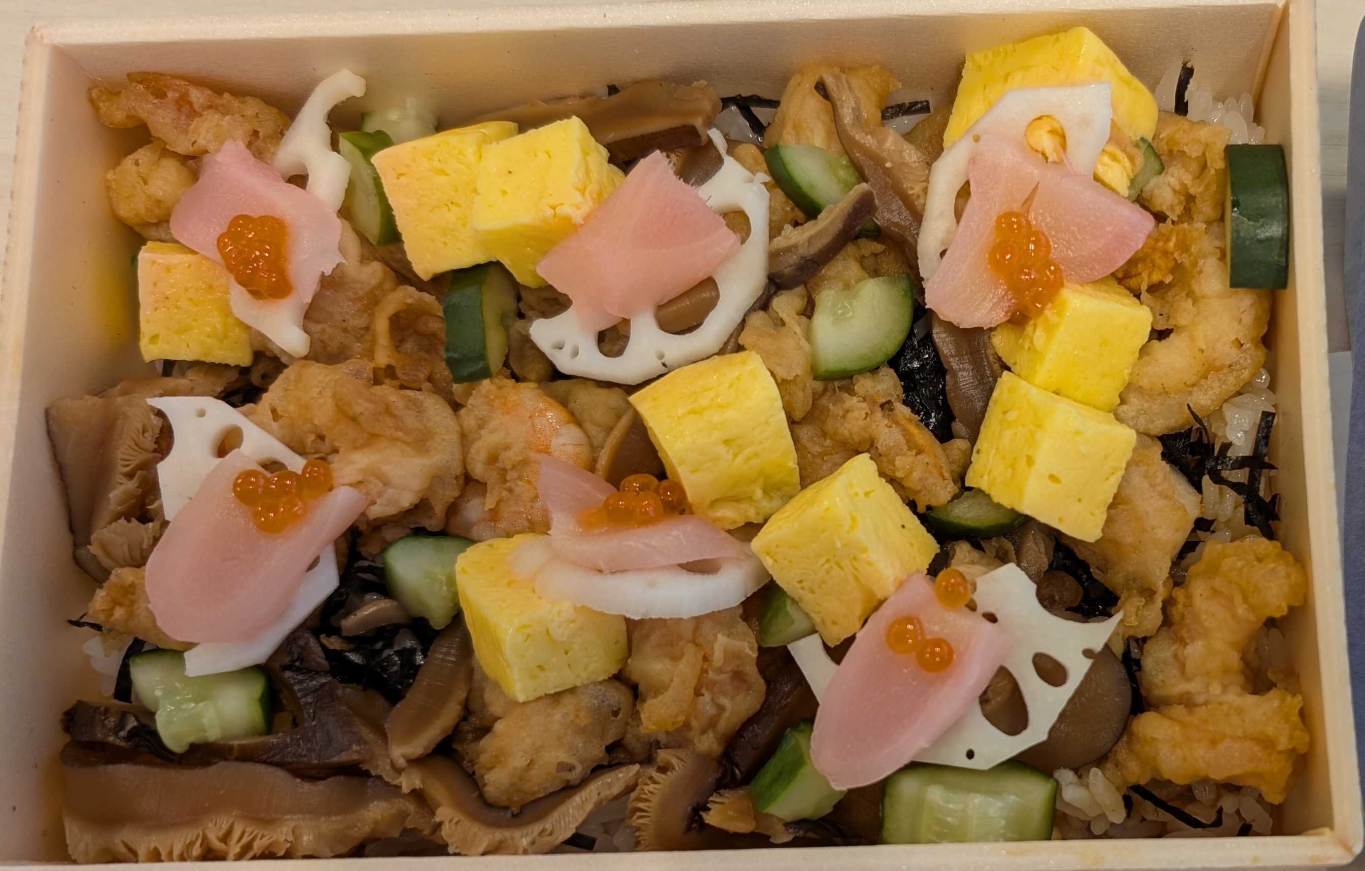前回、牡蠣のかき揚げがおいしかったお店です。今回は、季節・平日限定の天バラちらしを頂きました。初めて天バラちらしを食べました。普通のちらし寿司とは違う点は、生魚の代わりに海老天などの天ぷらが具材となっている点です。知りませんでした。生魚ではないので、鮮度にあまり左右されず、安定した味が出せるものかと思いました。また、しっかり冷えているものではなく、ほぼ常温という点も良く、味がわかりやすかったです。(お寿司はごはんが冷えすぎていると甘みがないですので)全体的には、茶色が多いですが、茶色いものはおいしい法則があります。シイタケの甘辛煮がひしめいており、酢飯との相性がばっちりです。おばあちゃんちのちらしずしを思い出します。そこに、時々、卵のふっくら感と、海老天の衣のふわっとごわごわ感が混ざって触感としてもかなり楽しいです。やわらかめの触感で食べやすさもポイントが高いです。おなかにやさしめのお弁当でした。てんぷらのおかげで腹持ちもよく、美味しさとコストパフォーマンスのバランスが良かったです。見た目 :★★★★☆おかずの大きさ:★★★★☆おかずの数 :★★★★★ボリューム :★★★★★味 :★★★★★お値段 :★★★☆☆ (1400円)総合評価 :26点/30点