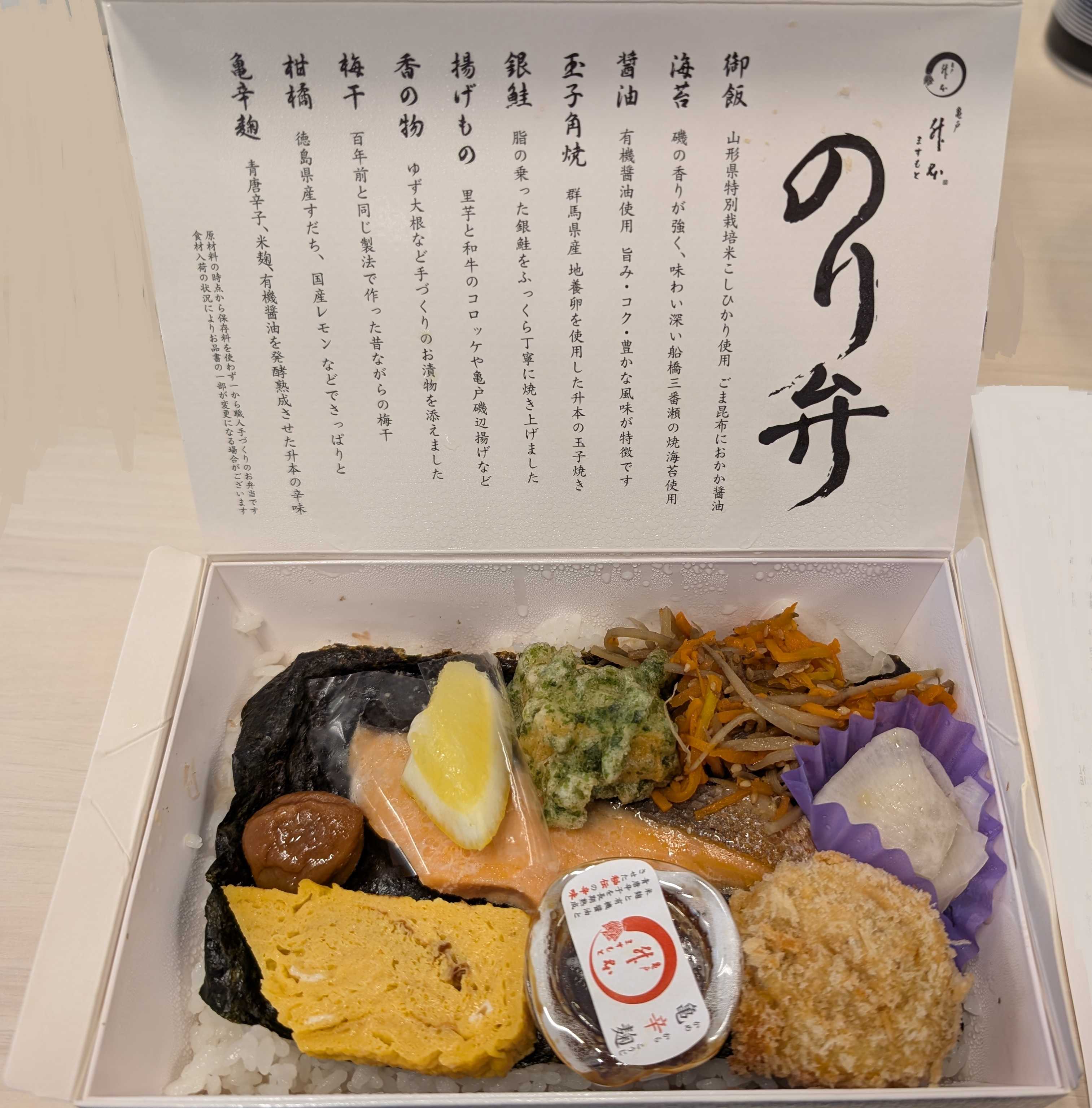 こちらのお店は、数種類のお弁当がありますが、その日によって入荷しないお弁当もあり、なかなか狙ったものを食べることができません。今回はその中でも、シンプルのり弁がありましたのでチョイスしました。蓋には説明文が。色々書いてありますが、こだわってますよとのことです。一つ一つ説明を見てから食べると、そちらに意識を向けるおかげでよりおいしく食べられますね。ラーメン屋によくある、おすすめの食べ方のようなものです。その中でもおいしかったものその1 コロッケ牛肉と「里芋」のコロッケです。ジャガイモではなく里芋になることで、里芋特有のねっちりとした触感になります。初めての体験です。その2 しゃけ脂の乗りがしつこくなく、かといってぱさぱさ過ぎない今は旬ではありませんが、旬のサケハラスだと脂っこすぎると思うので、今くらいの時期の方がいいのかも?皮がパリパリの方がいいので、皮目をもっと焼いてくれるともっと良かったです。その3 香の物柚子大根が入ることで、さっぱりとし、しょっぱい脂っこい弁当をキュッとまとめてくれます。触感もジャキジャキで、歯ごたえばっちり。ごはんの下には、ゴマ昆布とおかかが入っていますが、醤油はかなり薄めで、あくまでもおかずと一緒に食べてくださいねという思いが伝わってきます。弁当の中ではとっつきやすいお値段とボリューム。突出している点はありませんが、足りない部分も特にない。バランスのとれたお弁当でした。(逆に言うと特徴がなかったかなぁ)見た目 :★★★★☆おかずの大きさ:★★★★★おかずの数 :★★★★★ボリューム :★★★★☆味 :★★★★☆お値段 :★★★★☆ (1080円)総合評価 :26点/30点
