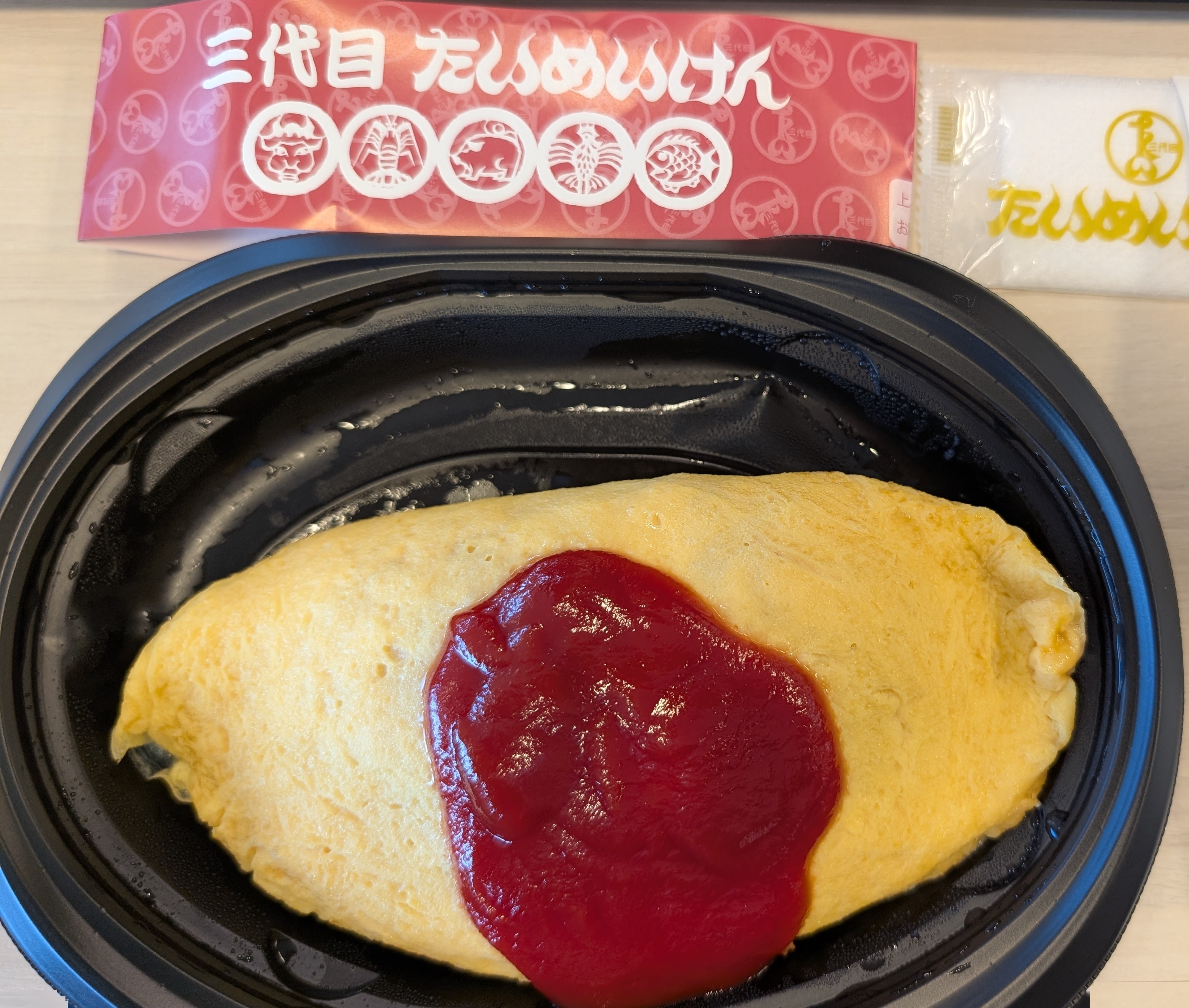 たいめいけんといえばオムライス!ということで、オムライスリベンジです。ケチャップとデミグラスがありましたが、もちろんケチャップを選択しました。今回はセールとのことで、1000円で食べられたのでラッキーでした。見た目はTHEオムライスで、余計なものは一切ありません。きいろいたまごのソファーにケチャップをかけるだけで子供が大ヨロコビです。中のライスは、ケチャップライスというよりはバターライスのケチャップ風味でした。具材はハムと玉ねぎが入っています。かなりバター強めの味で、ケチャップとたまごと一緒に食べるとクッションになりちょうどよい加減になります。ケチャップは酸っぱいが強く、コクがあまりないさっぱりタイプです。さっぱりがゆえに、バターの強い味との相性が非常に良いと感じました。たまごの量がとても多く、何個使っているのか?わかりませんが、4,5個使っていると予想されます。なので、オムレツで包まれているというイメージです。意外と?ですが、PFCバランスが素晴らしく、P:30g F:30g C:65gとかなりトレーニー向きのメニューでした。Fがもうちょっと少ないと嬉しいですが、そうするとコクがなくなるのでこれでいいと思います。ただ、量はあまり多くない点がちょっと残念でした。見た目 :★★★★★おかずの大きさ:★★★★☆おかずの数 :★★★☆☆ボリューム :★★★☆☆味 :★★★★☆お値段 :★★★★☆ (1000円)総合評価 :23点/30点