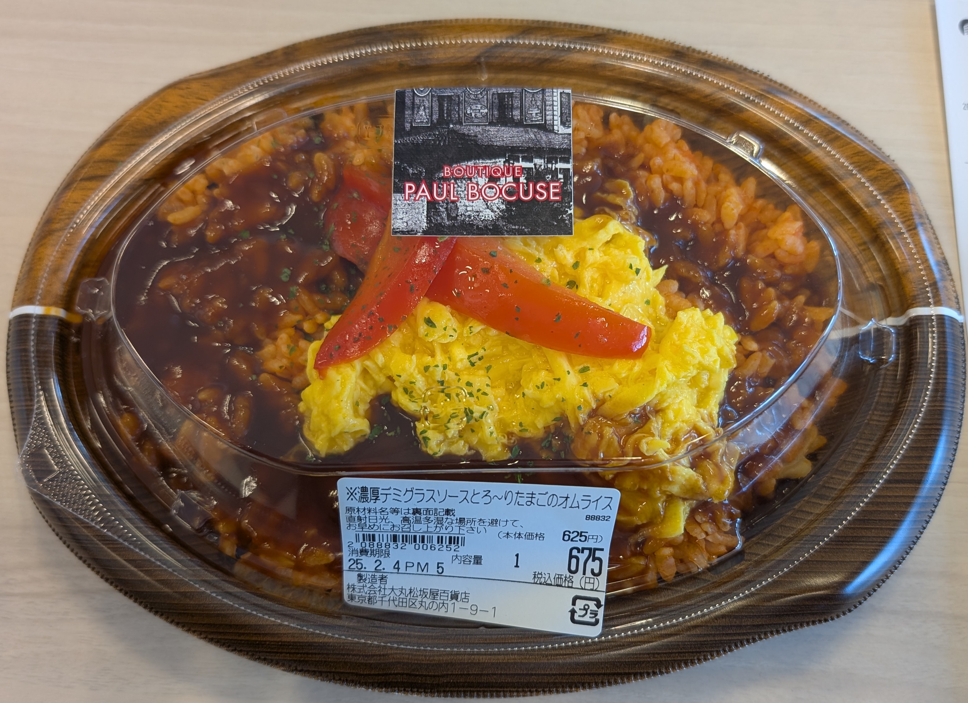 以前見かけてからずっと気になっていたオムライスです。店員さんに伺うと、明日までの限定商品だということで滑り込みセーフでした。チキンライスは、鶏もも、コーン、グリンピースのシンプルなものです。卵はスクランブルエッグの要領で作られたもので、ふわふわ触感でした。これといって、何か特別なオムライスではなかったです。洋食屋なのでデミグラスソースにはこだわりがありそうです。と言っても、私にはいいデミグラスソースが何なのかわからないので違いはよくわかりませんでした。ちょっとしょっぱめでくどいかなという印象を受けました。全体的に、デミグラスソース味になってしまい、チキンライスの意味があまりありませんでした。オムライスではデミグラスソースやビーフシチューをかけるものがおしゃれとされており、かつ、値段も高いですが、チキンライスとのマリアージュはほとんどないと思っています。チキンライスと同じくらいの味の強さでないとバランスは取れないので、強すぎる味のお二方は、単品でメニューを張った方がいいと思います。横文字に騙されているだけです。味としては断然ケチャップの方がいいと思います。値段は安いですが、若干ボリューム不足で、おにぎりをあと一つ食べたいくらいの量です。(腹6.5分目くらい?)見た目 :★★★☆☆おかずの大きさ:★★★★☆おかずの数 :★★☆☆☆ボリューム :★★★☆☆味 :★★☆☆☆お値段 :★★★★★ (675円)総合評価 :19点/30点