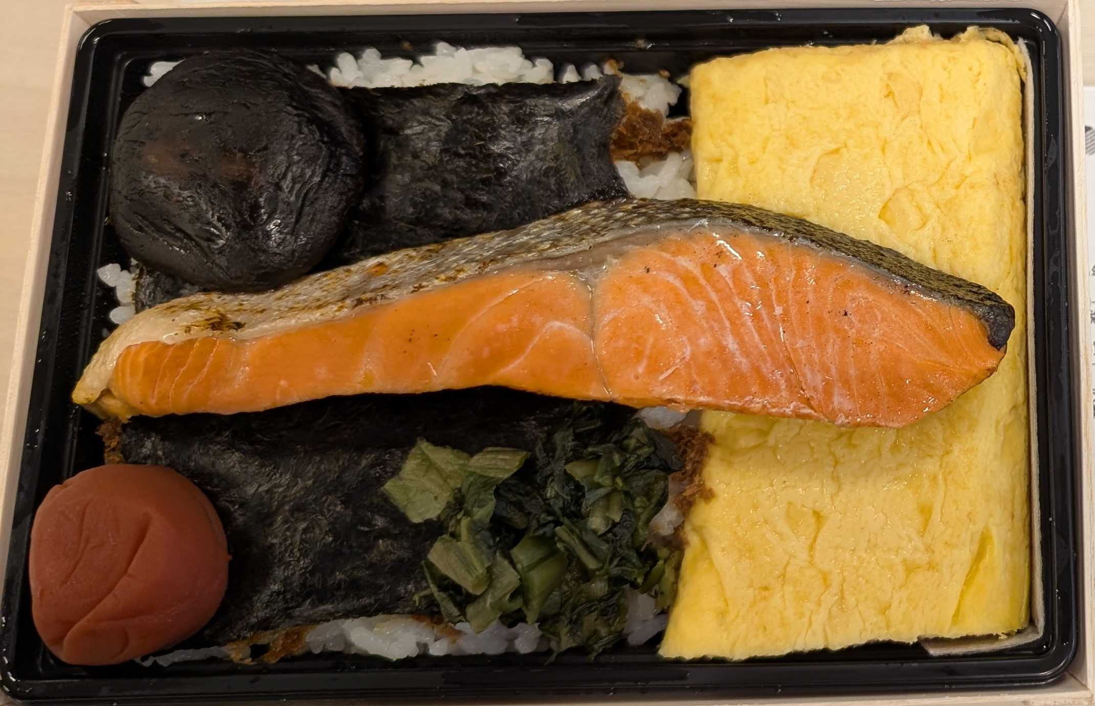 前回は、おにぎり弁当(おにぎり2つとちょっとしたおかず)を食べました。量が少なかったのでこの時は失敗しました。リベンジです。おかずは、大きな鮭と大きな卵焼きです。あとは、シイタケの佃煮と梅干、しょうゆ漬けのおかかです。とにかくしょっぱい。しょっぱいおかずにしょっぱいおかかご飯。どうしようもないです。マリアージュも何もない。いいものを使っていること以前に、お弁当として完成度が低すぎる。以上です。見た目 :★★☆☆☆おかずの大きさ:★★★★☆おかずの数 :★★★☆☆ボリューム :★★☆☆☆味 :★☆☆☆☆お値段 :★★★☆☆ (1350円)総合評価 :15点/30点