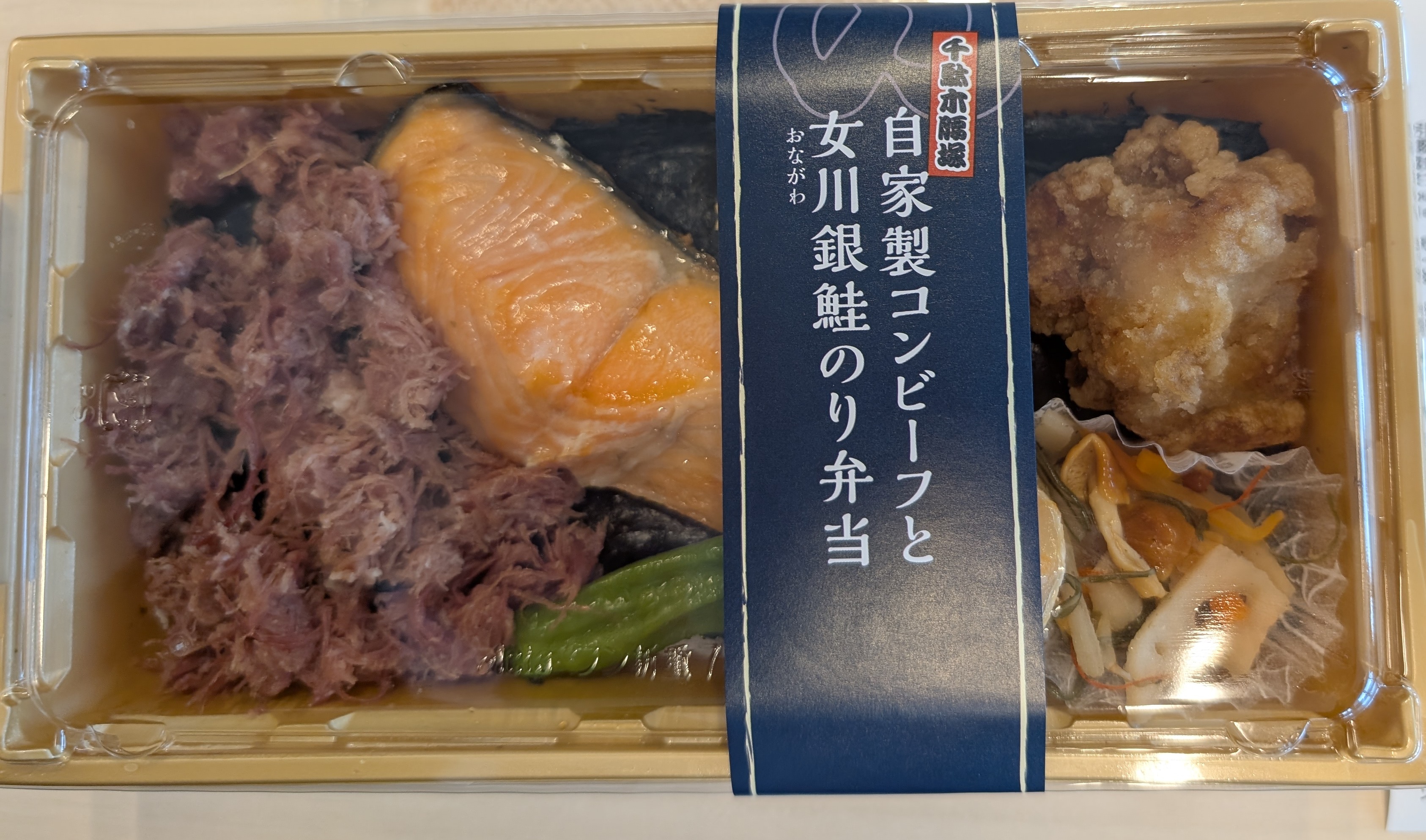 唐揚げ、脂ののった鮭、コンビーフなど脂っこいメニューが多かったです。野菜はほとんどなく、しし唐一本と少しの酢の物でした。ごはんのボリュームもほとんどなく、とりあえず敷き詰めているといった具合です。見た目としてコンビーフが載っているという点は、わかりやすかったです。のり弁当ならば、脂っこいものだけではなく、さっぱりさせるための工夫や野菜をもっと入れてほしかったと思います。脂っこいの一辺倒で、ごはんはあまり進まなかったです。初めてのコンビーフでしたが、そもそもとしてコンビーフがあまり好きではなさそうです。見た目 :★★★☆☆おかずの大きさ:★★★☆☆おかずの数 :★★☆☆☆ボリューム :★★☆☆☆味 :★☆☆☆☆お値段 :★★☆☆☆ (1500円)総合評価 :13点/30点