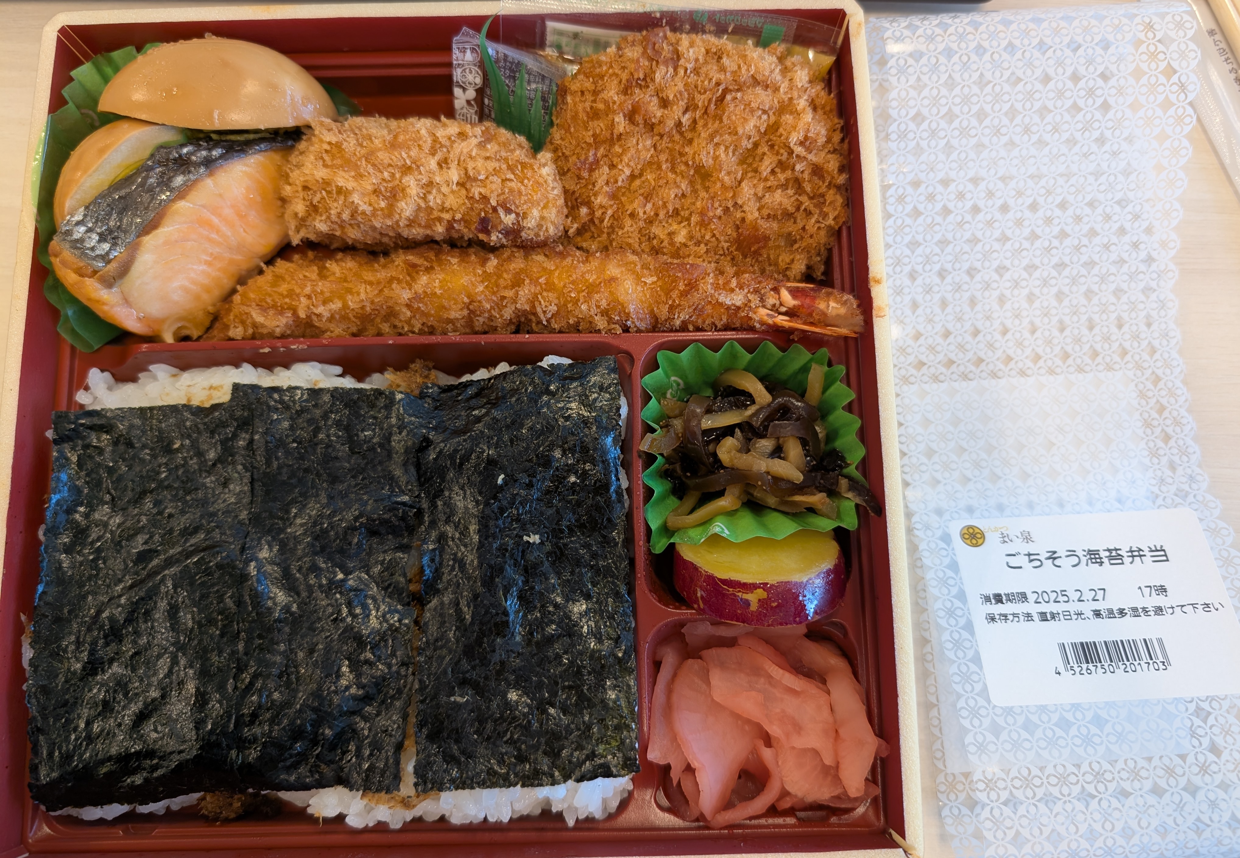 これで4回目の購入ですが、やっぱりおいしいですね。ここにきて新しい発見がありました。のり弁の海苔が全然切れなくてイライラすることありますよね?こちらののり弁は、おそらく海苔を一度お醤油に漬けている、もしくは細かい穴が開いているおかげで、箸で海苔がスッと切れるので、ストレスフリーです。お醤油いらずでしっかりとした味付け、ボリュームも十分。野菜やエビは塩味で甘さがしっかり引き立ち、マグロカツはあまじょっぱさで本当にご飯が進みます。もっと食べたいという気持ちが強く出るお弁当ですね。のり弁はいろいろはところが出しているので、今後比較していければと思います。 見た目 :★★★★★おかずの大きさ:★★★★★おかずの数 :★★★★☆ボリューム :★★★★☆味 :★★★★★お値段 :★★★★☆ (1188円)総合評価 :27点/30点