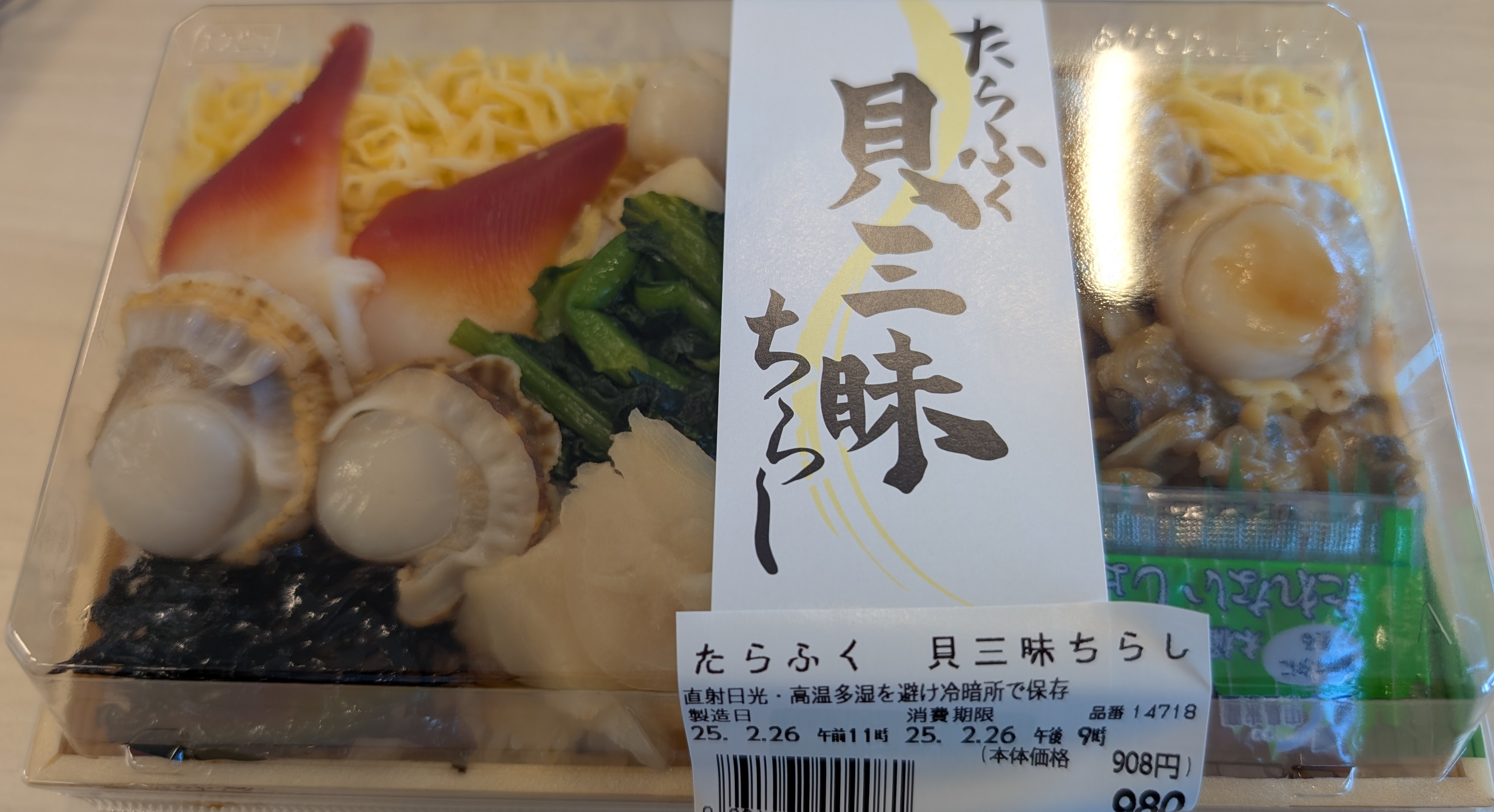 今日は趣向を変えて、スーパーのコーナーに足を運びました。寿司や丼ものもありましたが、「たらふく貝三昧ちらし」を選択しました。ほっき貝、ホタテ、あさりの3種類の貝がぎっしりと詰め込まれています。どの貝も甘く、歯ごたえもばっちりあり、おいしかったです。お醤油が珍しく、ジェル状になっていて、刺身から落ちにくいものになっていました。初めて使いましたが、ちらし寿司には不要ですかね。味のばらつきが出てしまいます。握り寿司だと重宝するかなという商品でした。しかし、面白い商品だと思いました。彩の点では、ほっき貝の赤、錦糸卵の黄色、ほうれん草の緑、貝の白とバランスよく、きれいな見た目です。赤と緑が入ると映えますね。ボリュームは持った感じだとないかな?という印象でしたが、貝の歯ごたえがかなりあったため、おなか一杯になりました。かむことは大切ですね。他の弁当屋さんに比べてスーパー内なので安い点もかなり評価が高いです。ダイマルでお寿司が食べたいときは、おすすめです。他も試してみようと思います。見た目 :★★★★★おかずの大きさ:★★★★☆おかずの数 :★★★★★ボリューム :★★★★☆味 :★★★★☆お値段 :★★★★★ (980円)総合評価 :27点/30点