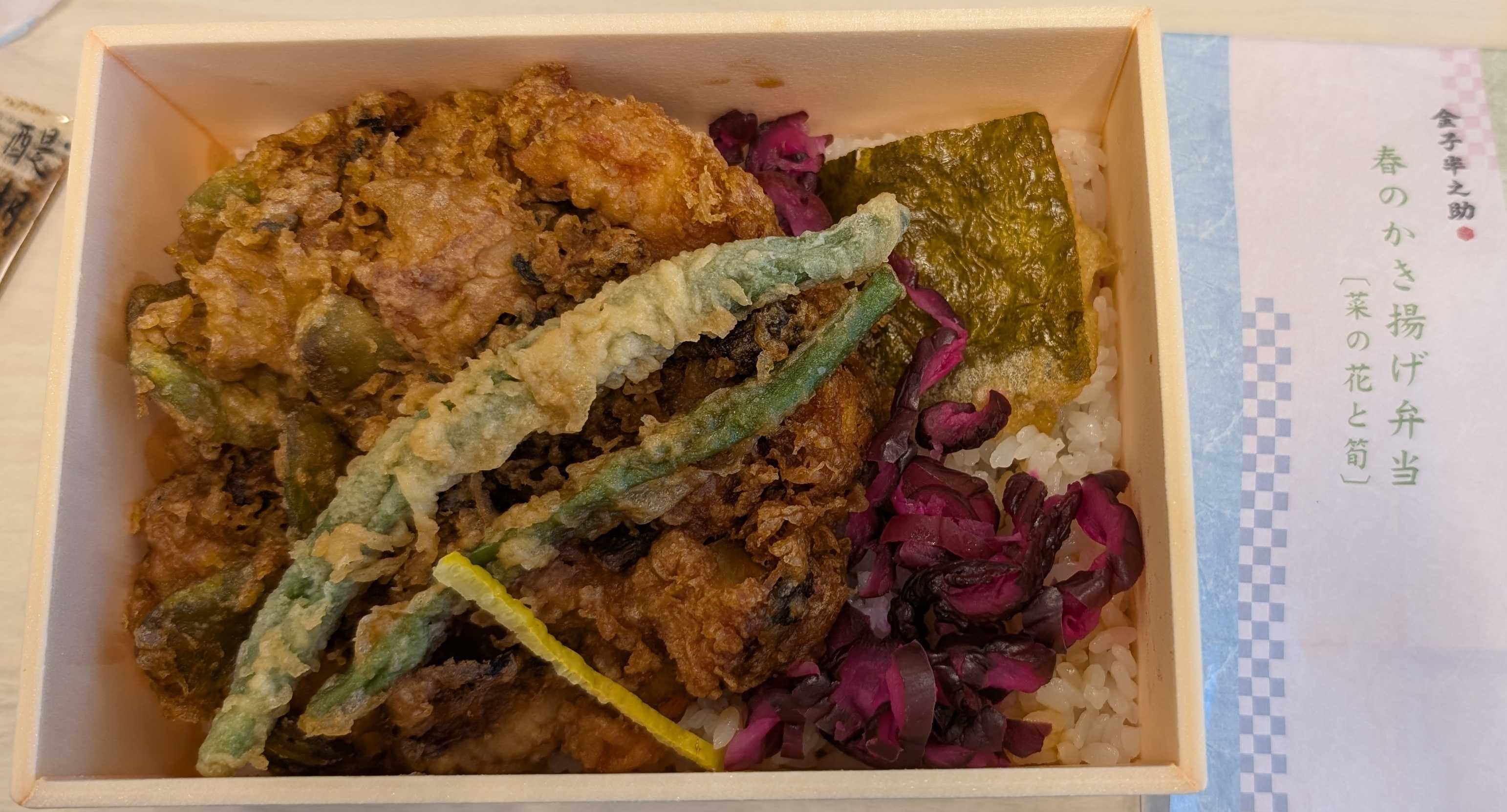 今回は、季節のかき揚げ弁当を選びました。タケノコと菜の花に釣られました。大きなかき揚げ1つ、海苔天、いんげん天が2本入っています。だいぶ細いですが、柚子皮も。もちろんメインはかき揚げです。そらまめが軸となっております。一般的な玉ねぎ軸とは違い、甘みは少なく、豆特有のしっとりほろほろの触感になっています。これによって、他メインの食材の邪魔をすることがなく、非常に上品に仕上がるのだなと思いました。海老やイカがゴロゴロ入っており、かなりがっつりです。歯ごたえや触感もよく、不思議とご飯を食べたいと思わないです。(ほめてますよ!)かき揚げだけで食事として完結しています。マイナスポイントは、”季節の”と書いてありますが、この食材を全く感じません。それでも十分おいしいですが、もう少し、旬の食材の割合を増やしていただけると嘘偽りない弁当になるかと思います。ちょっと値段はしますが、揚げ物ですので腹持ちもよく、味もしっかりしています。贅沢したいなという日はいいと思います。見た目 :★★★★☆おかずの大きさ:★★★★★おかずの数 :★★★★☆ボリューム :★★★★★味 :★★★★★お値段 :★★★☆☆ (1500円)総合評価 :26点/30点