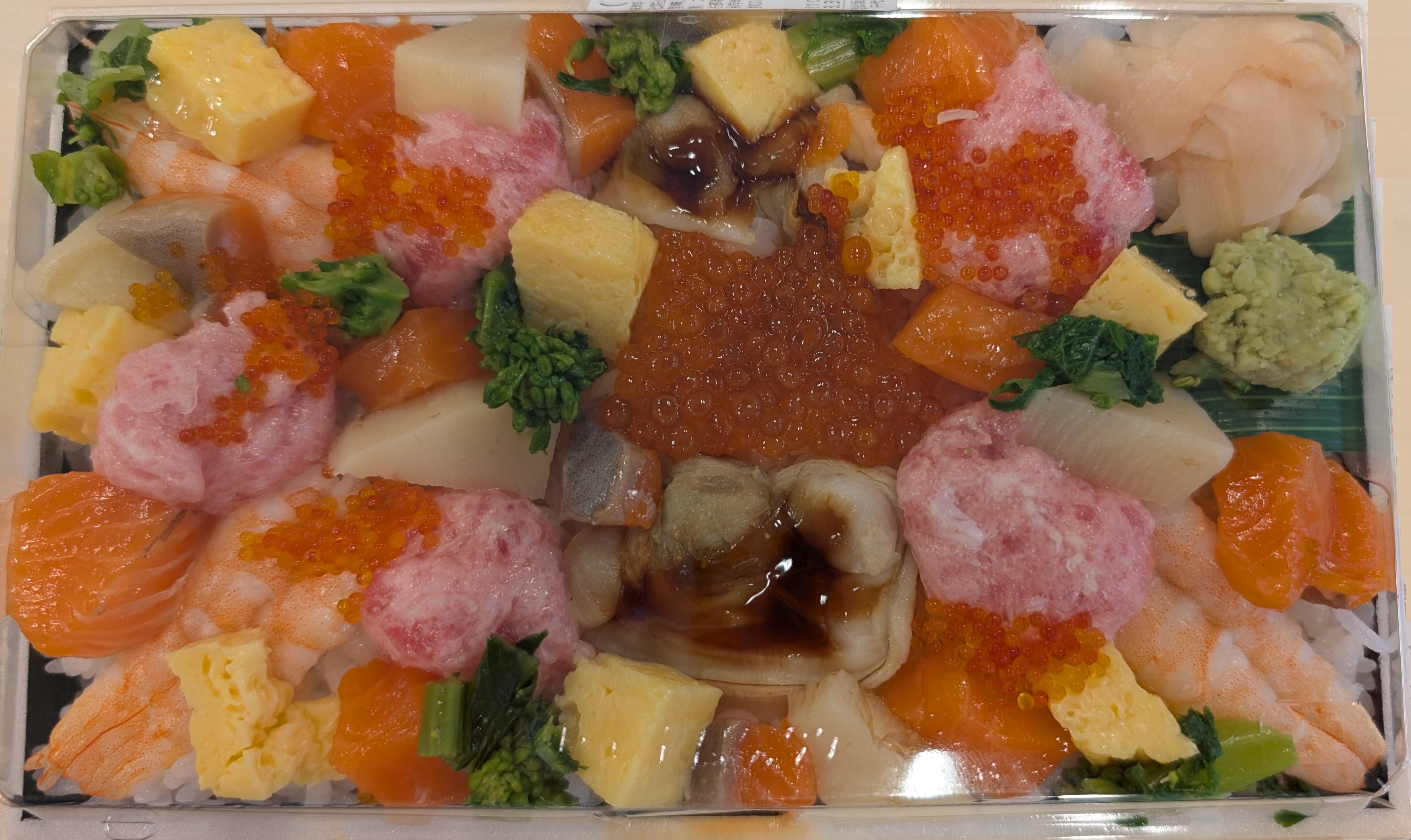 ひな祭りなので、ちらしずしを食べたい!とのことで、ひなチラシを選びました。とても豪勢なお昼ご飯になりました。春を意識しており、菜の花、タケノコが乗っています。菜の花はお浸し、タケノコは土佐煮になっており、一つでも十分な味わいです。彩が非常に豊かで、紅でサケ、いくら、とびっこ、ネギトロ、エビ緑で菜の花、わさび黄でたけのこ、たまご、ガリその他でハマグリで彩られています。全体的に、新鮮でした。魚類はぷりぷりで、いくらは箸でつまんだ時にはじけるくらいです。はじけて、Yシャツにシミができました。ネギトロの甘みが非常に強く、他の素材を圧倒してきます。こちらのお店のネギトロは多分ですが、かなりおいしいかと思います。他にもネギトロの商品が多かったです。わき役ではございますが、ワサビとガリがおいしいことも特徴です。練わさびではなく、あらずりになっており、ポリポリとした触感とつんっとした風味が非常に濃厚です。お値段は高いですが、たまの贅沢であれば奮発してもよいと思います。見た目 :★★★★★おかずの大きさ:★★★★★おかずの数 :★★★★★ボリューム :★★★★☆味 :★★★★☆お値段 :★★☆☆☆ (1580円)総合評価 :25点/30点