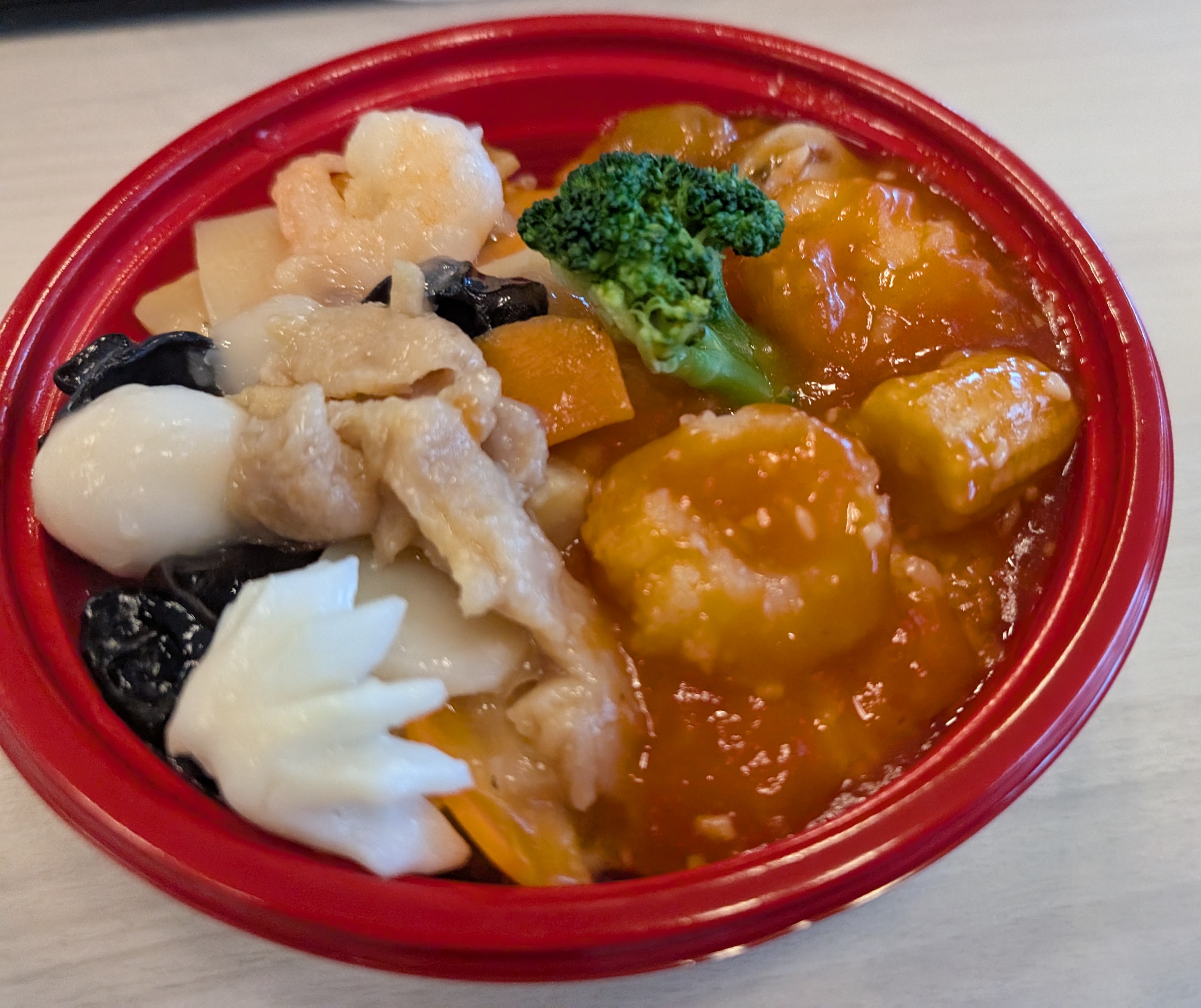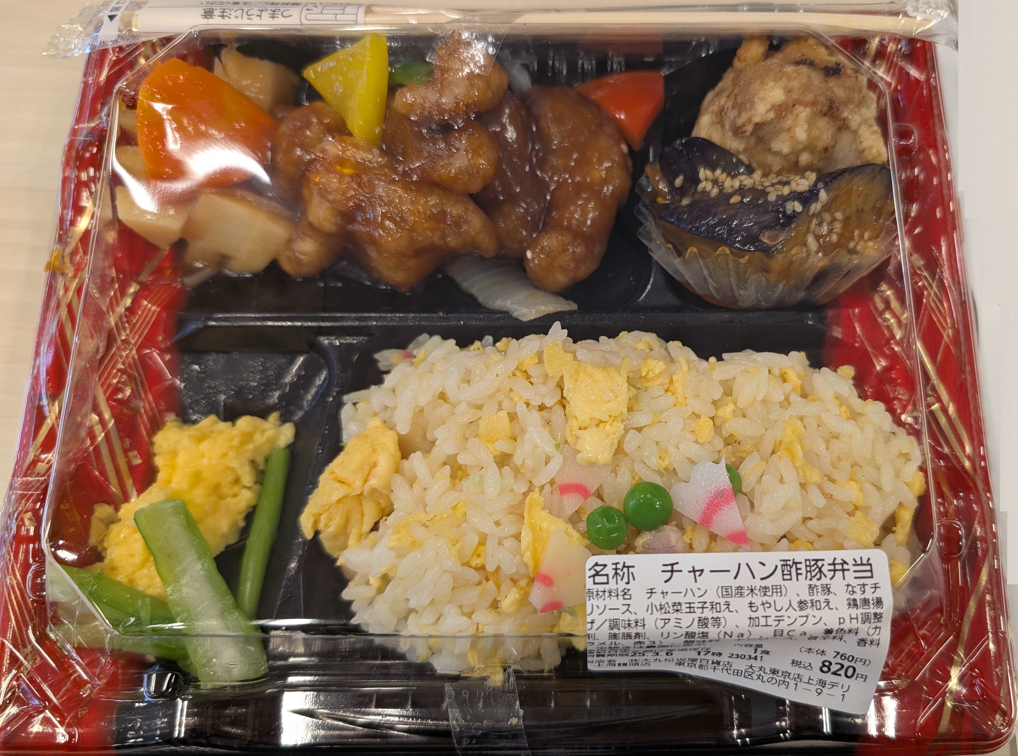 ほとんどのお店を回り切ったので、横展開を始めます。チャーハン・酢豚・茄子のチリソース・唐揚げのセットです。チャーハンはほとんど塩気がなく、卵とチャーシューの混ぜご飯のような味でした。しかし、油が回っているということがなく、一般のチャーハンよりはカロリーは低めかなと思います。酢豚は、豚は大きいですが、衣の部分が多いため、こちらはカロリー高めかと思います。野菜は少なめです。ということでプラスマイナスゼロですね。一番おいしいのは唐揚げでした。醤油の下味がしっかりしており、これは冷めてもおいしい唐揚げだと思いました。全体的には、味のバランスが少ししょっぱいと少し酸っぱいに寄っており、食べていて、メリハリを感じませんでした。辛い甘いは全くなかったような???弁当?としては成り立っていないかなと思います。おかずを活かすなら白米の方がいいですかね。一つ一つがお酒のおともで評価すれば、高めです。私としては、チャーハンと酢豚ははずれですかね。見た目 :★★★★☆おかずの大きさ:★★★★☆おかずの数 :★★★☆☆ボリューム :★★★☆☆味 :★★☆☆☆お値段 :★★★★★ (820円)総合評価 :21点/30点