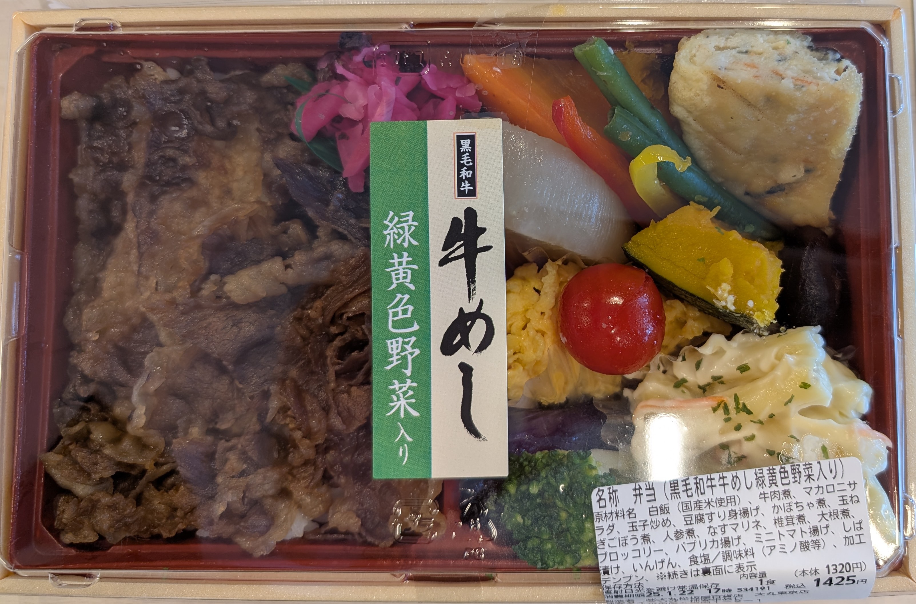 色どりがきれいな、牛めしのお弁当です。牛めしは、玉ねぎと牛蒡の入った程よい甘めの味付けでした。しつこくなく、どんどんと食べ進められます。牛肉も脂身が少なく、赤身のしっかりとした歯ごたえと味を感じられます。何よりもおかずの数が多く、野菜がとても多いです。健康的にもかなり高評価です。中央右の大根やニンジン、なすは一つ一つが大きく、味付けはマリネのように、若干のお酢を感じる味付けで、あっさりとしています。トマトの裏に卵炒めが隠れていますが、中華風味の味で、かなりあっさりとした塩味です。イメージは、卵ときくらげの炒め物を想像していただければと思います。全体的に、甘めの味付けで、しょっぱいものはお漬物くらいでした。そのため、ごはんが進むというよりも、それぞれ1品ずつ楽しむといったコンセプトなのかなという印象を受けました。ボリュームも十分あり、自信をもってお勧めできます。ただ、がっつり食べたい人には向いていないです。見た目 :★★★★★おかずの大きさ:★★★★★おかずの数 :★★★★★ボリューム :★★★★☆味 :★★★★☆お値段 :★★★☆☆ (1425円)総合評価 :26点/30点