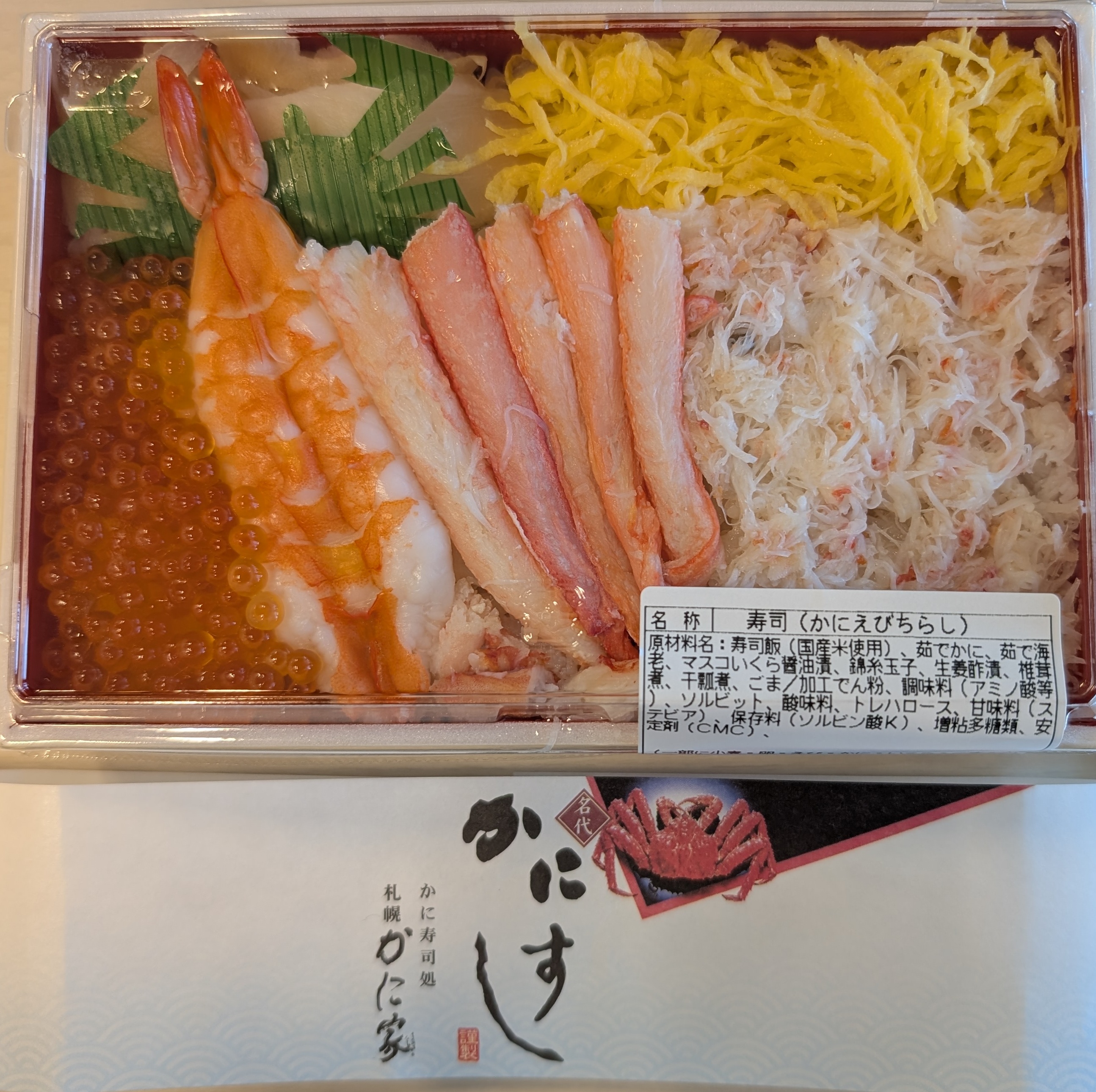 かに寿司専門店のちらし寿司です。かにちらしもありましたが、彩が良いかにえびちらしをチョイスしました。えび、いくら、かに、錦糸卵、ガリのリッチなちらし寿司です。かにはほぼ塩味しかしない、スカスカでした。ガリと錦糸卵が一番おいしかったです。ご飯はべちゃべちゃでした。量は普通です。お寿司をダイマルで3回ほど買っていますが、どの店舗も私としてははずれかなと思っています。鮮度が命という点が、弁当というカテゴリーにあまりにもあっていないと推察します。同じお値段で、回転寿司に行った方が満足です。見た目 :★★★★☆おかずの大きさ:★★★☆☆おかずの数 :★★★☆☆ボリューム :★★★☆☆味 :★☆☆☆☆お値段 :★★☆☆☆ (1404円)総合評価 :16点/30点
