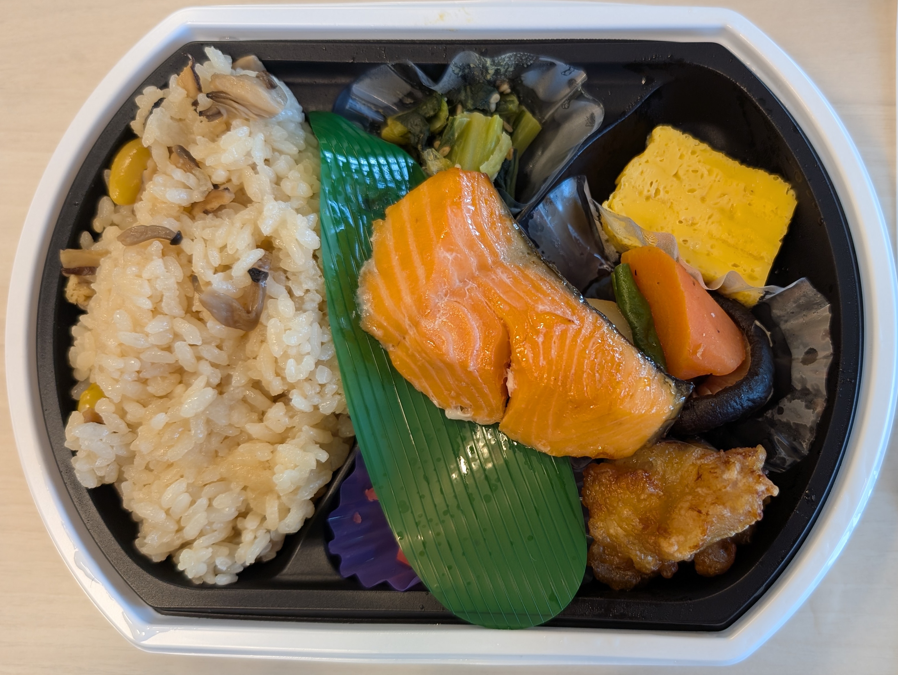 東京の地下ではリーズナブルな価格のお弁当です。ご飯はしめじ、油揚げ、銀杏の炊き込みご飯です。炊き込みご飯ではありますが、味付けはほとんどされておらず、おかずと一緒に食べるように設定されていると感じました。メインは、鮭、鰈から選べましたので、鮭を選択しました。おいしい塩じゃけでした。その他おかずは、ワサビ菜の胡麻和え、筑前煮、唐揚げ、赤カブ漬です。甘いおかず、しょっぱいおかずのバランスが良かったです。味としては普通でした。お安い分、ボリュームに関しては若干物足りません。和食弁当の平均のようなお弁当でした。見た目 :★★★☆☆おかずの大きさ:★★★☆☆おかずの数 :★★★☆☆ボリューム :★★★☆☆味 :★★★☆☆お値段 :★★★★★ (880円)総合評価 :20点/30点