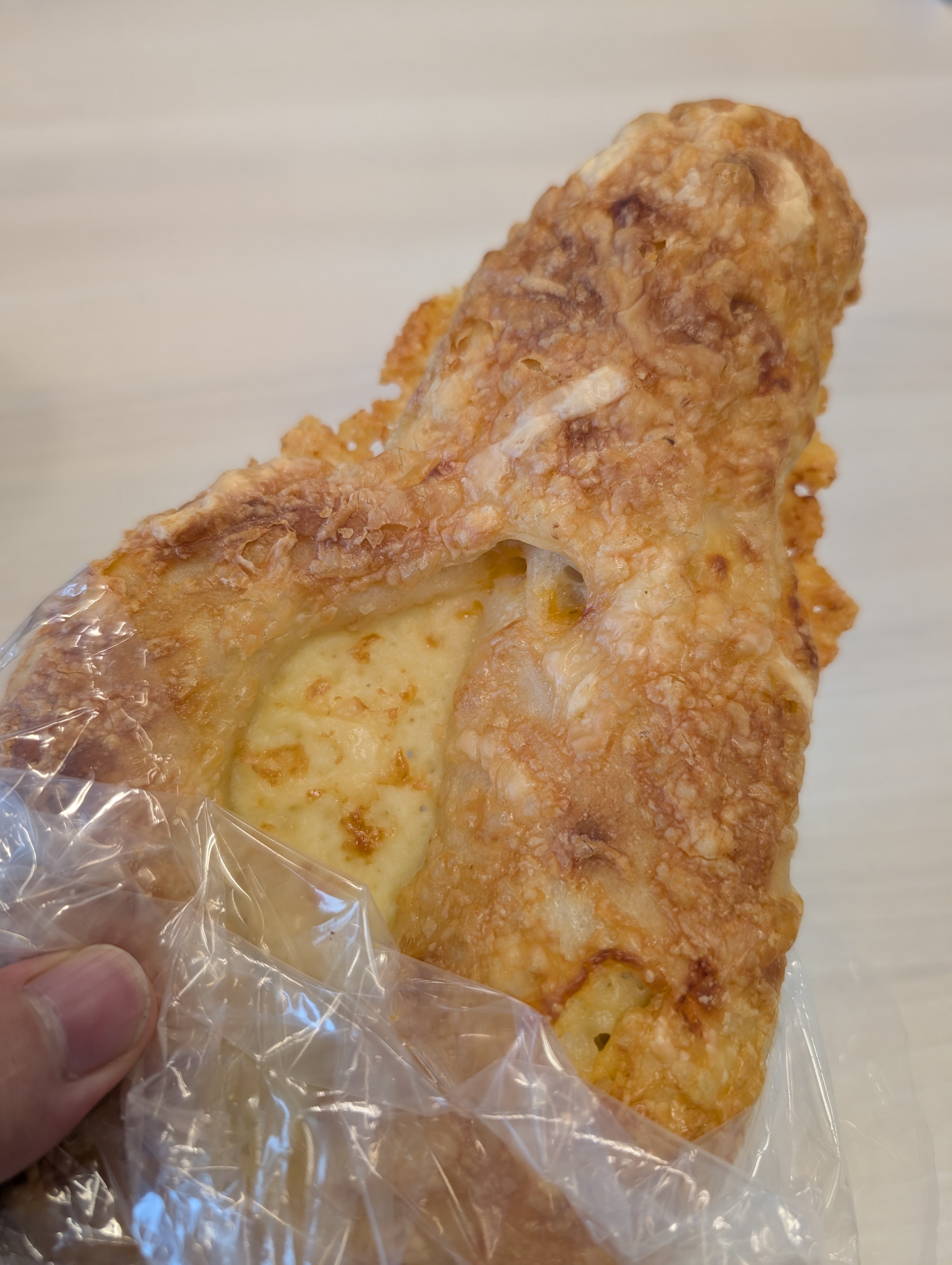 名前の通り、3種類のチーズのパンです。ミモレット・ゴーダ・ステッペンチーズを使っているとのことです。チーズを表面に焼き付けてパリパリの部分としっとりの部分とあり、場所によって触感が異なる点が良かったです。また、中央部分はチーズのみの薄い生地になっているので、チーズのみの味も楽しめました。生地の中にもチーズが練りこんであり、時々味が変わる点もよかったです。大きさは、皆さんが普段使っているPCほどの大きさがあります。かなりもっちりとしていて、歯ごたえがしっかりとしています。後半は、顎が疲れました。そのため、大きさと咀嚼回数の相乗効果でかなりおなかいっぱいです。かなり安く、ボリュームもある、おいしいチーズパンでした。ただ、大きくて味も大味なので、結構飽きます。生地が堅いことも助長して、後半はなお大変でした。これよりも小さいサイズが300円くらいなので、そちらで一度お試ししてもいいと思います。「あの人なんで机を背に向けてパンかじっているのだろう」と思われた方、恵方が逆方向だっただけです。昨日、恵方巻を食べ損ねたので、このパンで代用していました。見た目 :★★★★☆おかずの大きさ:★★★★★おかずの数 :★★☆☆☆ボリューム :★★★★★味 :★★★★☆お値段 :★★★★★ (648円)総合評価 :25点/30点