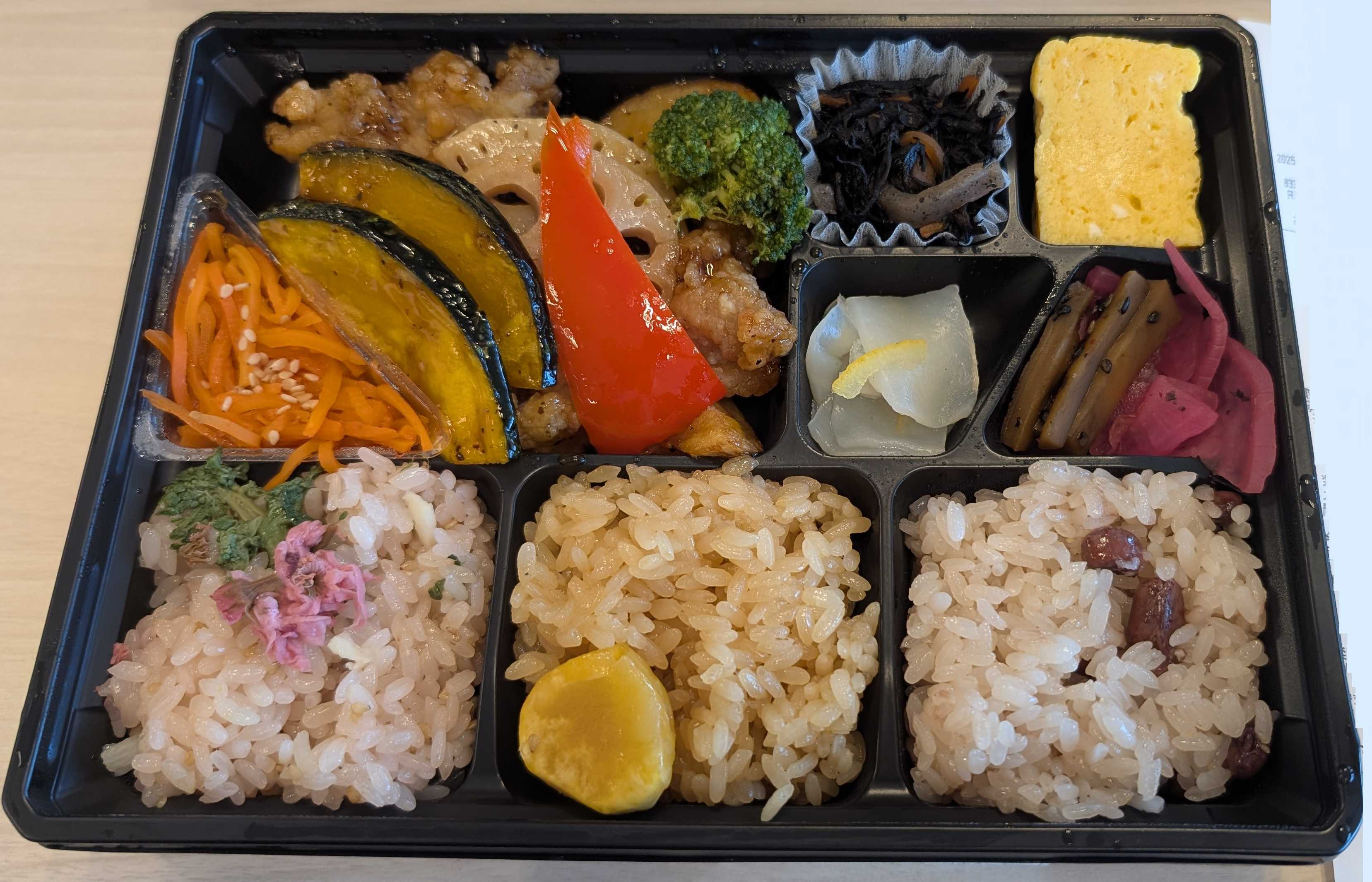 全てのお米がおこわになっているお店です。今回は、一番人気の野菜とチキン黒酢弁当を選択しました。まず、彩がきれいですね。3色のおこわに、カボチャとパプリカの鮮やかな彩が引き立たせます。おこわは、菜の花と桜、栗、赤飯の3種類あります。どれも味が吐出していることがなく、あくまでもおかずと一緒に食べるといったコンセプトになっているかと思います。確かに、味の濃いものに味付けご飯ではくどいですので、このくらいがちょうどよいです。おかずは、唐揚げに黒酢ソースをかけたものがメインです。しっとりとした触感で、酢豚に近いです。しかし、唐揚げの良さもあり、下味の良さも兼ねています。野菜もカボチャ、パプリカ、レンコンの素揚げ?が付いています。一つ一つが大きいので、食べた感もあります。黒酢ソースが別途で付いているので、味付けをコントロールできる点もよいです。その他、おかずもおいしいです。おこわメインのはずですが、このお店はおかずが全体的にレベルが高く、ごはんが進みますが、味が濃すぎない点が非常に高評価です。カロリーが500kcal以下という点も評価は割れますが、私個人としてはダイエット中なのでかなりうれしいです。もち米である点もあり、腹持ちがかなり良いです。見た目以上にどっしりとした量で、腹持ちがいい、野菜も多い。ちょっとお値段はりますが、おすすめです。見た目 :★★★★★おかずの大きさ:★★★★★おかずの数 :★★★★★ボリューム :★★★☆☆味 :★★★★★お値段 :★★★★☆ (1179円)総合評価 :27点/30点