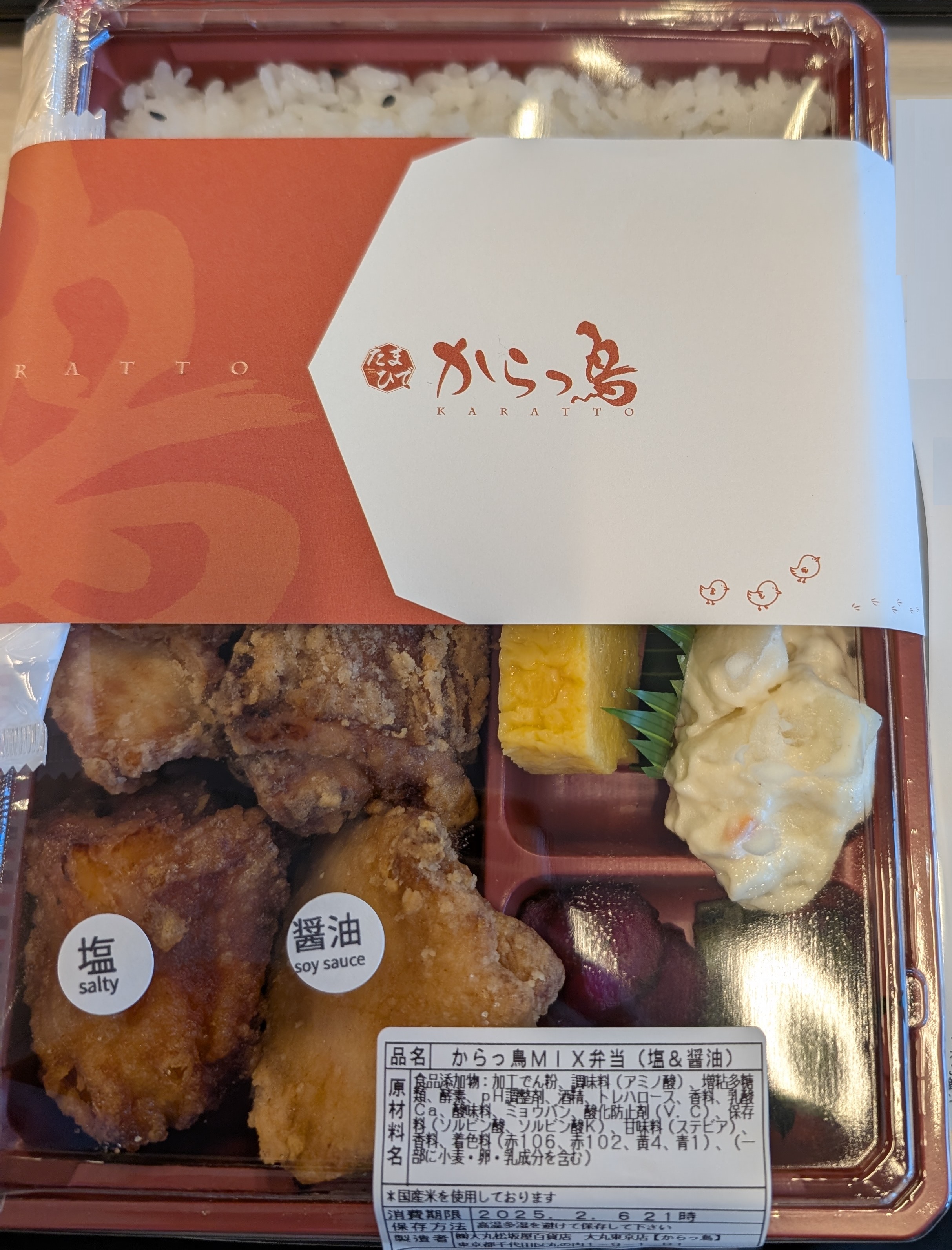 唐揚げ専門店のからっ鳥(と)です。今回は、MIX弁当を頼みました。MIXとは何か??と言いますと、塩・醤油のむね・もも唐揚げが付いてくるセットになります。4種類のから揚げが食べられるということです。唐揚げ一つ一つは、大体2口サイズで大きさは申し分ございません。一種類一口ですと、やはりさみしいので、これくらい大きいと嬉しいです。一番おいしい種類は、やはり醤油のももです。ニンニクと醤油味がしっかりと効いており、鳥の脂と相まってごはんが進みます。他は、ぱさぱさしていることはありませんが、特別ジューシーかといわれると普通でした。唐揚げ以外は、卵焼きとポテトサラダとお漬物が付いています。こちらは特にコメントありません。構成はTHE唐揚げ弁当でした。となりますと、他の唐揚げ弁当と比べざるを得ません。値段は、しょうがないですが高めです。味は、おいしいです、が、特別おいしいということでもないような。ボリュームは普通です。そのため、ちょっと高い唐揚げ弁当という印象でした。でも、唐揚げ弁当に求めるものは、がっつりおなか一杯だと思います。ごはん大盛オプションがあるほうがテンションが上がると思いました。見た目 :★★★★☆ (茶色い弁当ほどおいしいです)おかずの大きさ:★★★★★おかずの数 :★★★★☆ボリューム :★★★☆☆味 :★★★★☆お値段 :★★★☆☆ (1296円)総合評価 :23点/30点