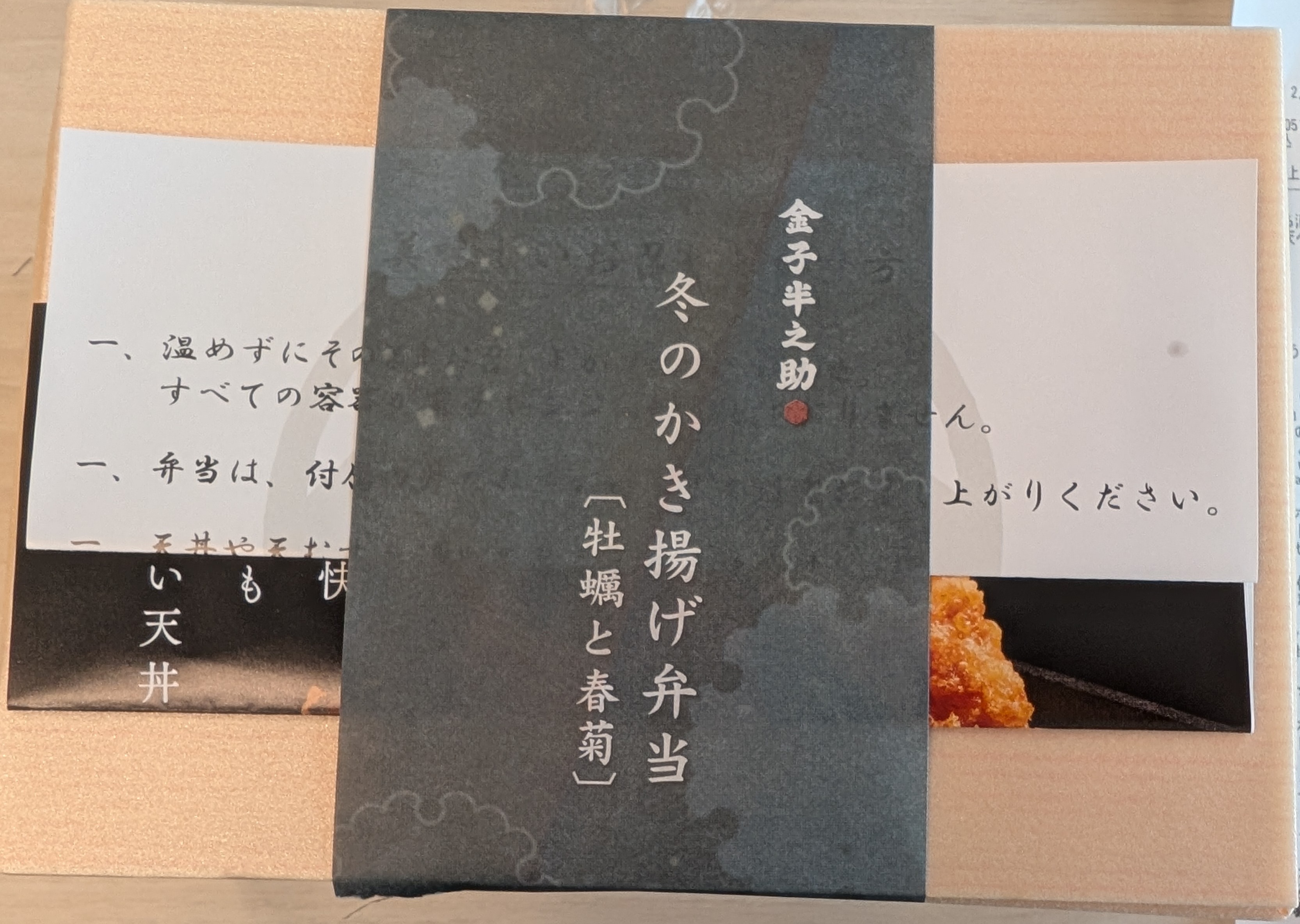 日本橋の老舗の天丼屋です。今回は一番人気の江戸前天丼弁当ではなく、春菊と牡蠣が好きなので、季節のかき揚げをチョイスしました。おかずは大きなかき揚げ一品のみ!相当の自信があるとお見受けしました。海老、イカ、レンコンがメインです。一つ一つが非常に大きく、ゴロゴロ入っており、歯ごたえばっちりです。特にイカの程よい弾力が楽しさを引き立てます。味の主張もしっかりしており、食べる部分によって味が変わって非常に楽しめました。逆に、春菊と牡蠣の味が負けてしまっており、残念でしたが、それを踏まえても、相当おいしいかき揚げでした。隠し味??なのか柑橘系を感じました。前半の海鮮たちのわちゃわちゃした味をスッと和らげてくれます。味変の手段として、七味唐辛子と天つゆが付いています。この、七味唐辛子が、またおいしいこと。おそらく、唐辛子と柚子が多めなのか、さっぱりとした味変になり、脂っぽさを感じませんでした。天つゆもだしと醤油が強めで、しっかりと煮詰めている味ですので、かけた時に、ごはんがしゃばしゃばになることもありませんでした。買ったときは少ないかな??と思いましたが、全くそのようなことはなく、かなりがっつりとおなかにたまりました。(単純に揚げ物だからかもしれませんが)単純に普段食べている天丼とは一ステージ違うなぁと思いました。もちろん、普段食べている600円くらいの天丼もおいしいのですが、具材や付け合わせの贅沢さをしっかりと感じられる良いお弁当でした。高いこと以外は十分にお勧めできます。今後は江戸前天丼弁当を食べてみたいと思いました。見た目 :★★★★★ (見た目のインパクトが素晴らしい)おかずの大きさ:★★★★★ (でかいっ!)おかずの数 :★★★★★ボリューム :★★★★★味 :★★★★★お値段 :★★☆☆☆ (1500円)総合評価 :27点/30点