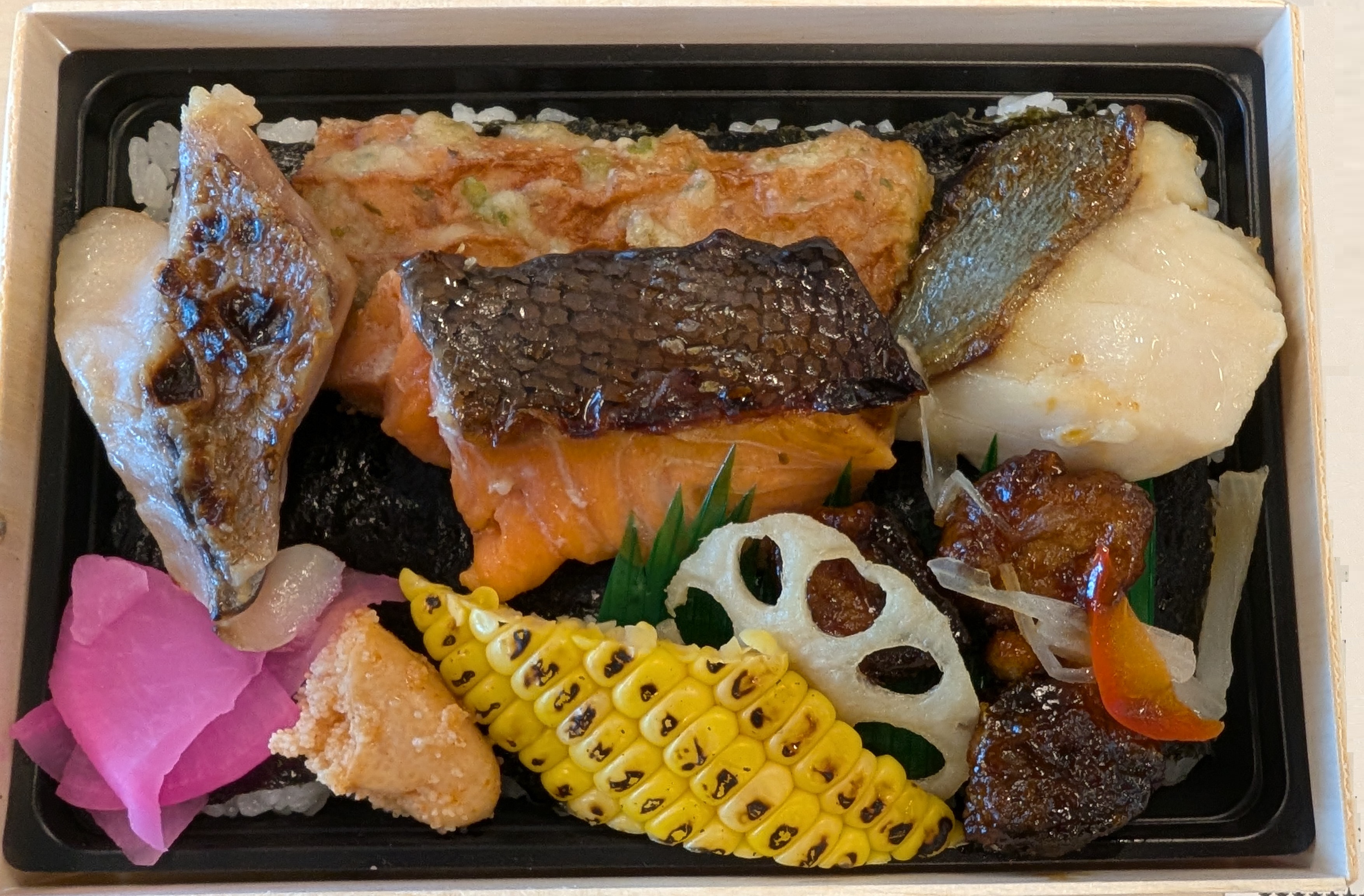 以前、コンプリートしたと思っていましたが、銀鱈の弁当が残っていました。もちろんメインは銀鱈の西京漬け。脂がのっており、非常においしいですが、だいぶ味が易しいです。海苔と一緒に食べると、海苔の味に負けてしまいます。また、残念ながら、骨が多い。。。食べるときにかなりのストレスです。つくねは、軟骨の入ったタイプのつくねです。こりこり触感が面白いですが、1個じゃ少ないっ!わざわざ弁当の名前に入れるほどではないかな?後、ちくわの磯部揚げがありますが、これは衣が多い。脂っこい!衣を削ってもらえたら、だいぶいいかなと思いました。総評としては、高い割にはねぇ、、、といった感じでした。銀鱈の西京漬けのベースの値段に引っ張られているので、割高なのは仕方ないです。無理に食べなくていいかなと思います。見た目 :★★★★☆おかずの大きさ:★★★★☆おかずの数 :★★★★☆ボリューム :★★★☆☆味 :★★☆☆☆お値段 :★★☆☆☆ (1620円)総合評価 :19点/30点