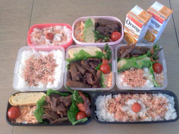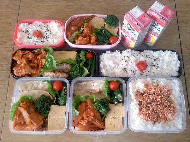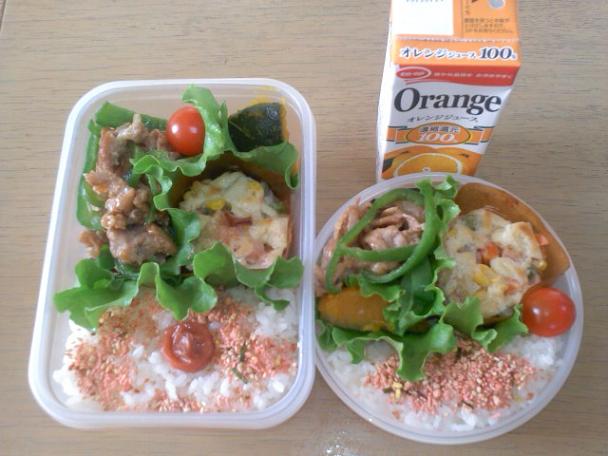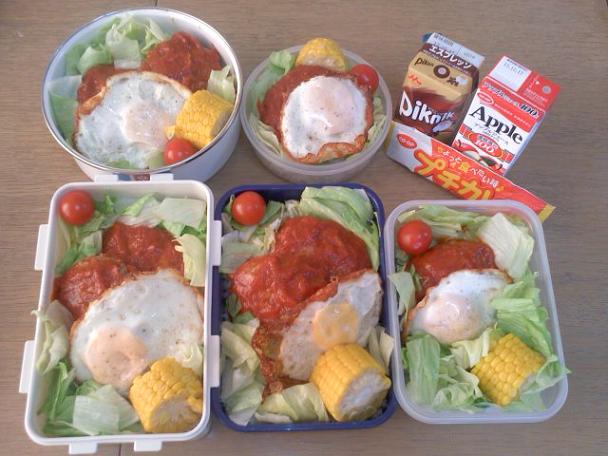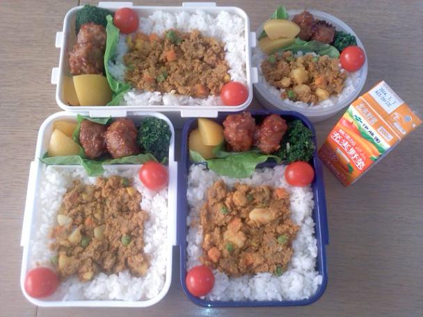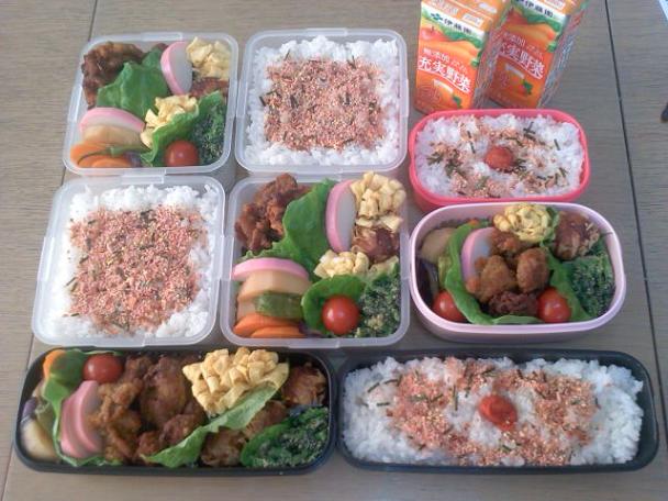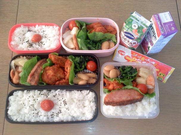 ≪メニュー≫ごはん(梅干し&黒ゴマ、鮭ふりかけ、プチカレー)チキンチョップハムソテージャーマンポテト菜の花のごまあえ白花豆サンチュ、ミニトマト(長女、長男)ジュース先週末まで「期末テスト」だった長男(高3)達CT高。今週から終業式まではもう、午前中授業のみ。でも、昨日は午後から、就職希望者のための『面接講習会』というのがあったそうな。これが、外部から面接指導の業者が来て指導するそうで、「めっちゃ厳しいらしいよ」とのこと。私は、イマドキはそんな業者まであるのかと、そっちの方に驚いてしまったよちなみに、同時間帯、長男達進学希望者は、進路説明を受けていたそう。オープンキャンパスの意義とか色々。長男も、第一志望校と同じ学科がある大阪の大学のOPに行け、と、ススめられたとのこと。比較するのも大事、ということで、長男は、夏休み中に時間があったら行こうかな、とは言うものの、「初年度の学費が200万かかるし、バスケ部弱いし、進学する気はない」と。だったら、行かんといてくれ。OPに行く交通費だって、バカにならんのだよなお、今日は長男は、一度帰宅してからジムに行くそうで、お弁当もハーフサイズ。家でもう一度お昼を食べるそう(写真上)長女(大2)、長男、次男(中2)の分(写真下)ダンナ、三男(中2)の分