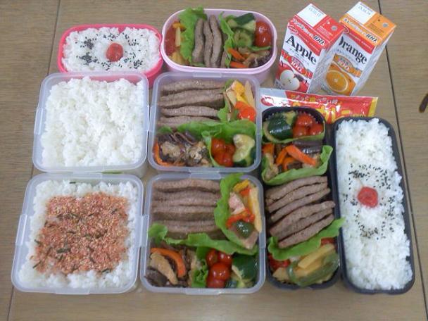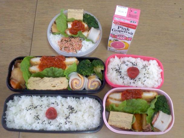 昨日は、長男(高3)の右膝の定期健診があった。診察前に両脚の筋力を測定するのだが、その結果を見た主治医が、「右脚の方が筋力があるね。あれ手術したの、右脚だよね」と、笑っていた。そして、来月が術後9ヵ月なのだが、健診でレントゲンを撮り、結果がよければ復帰、とのこと。やったねケガしてからの1年、本当にリハビリと筋トレに頑張ってきたから、本当に嬉しいねしかし、帰りの車だったかで、本人はもう、大学に行ってインカレに出るんだ、という話をしていた。「代々木第2体育館でやるんだよ。見に来るかね」と言うから、「もちろん、行くさぁ。でも、その前に高校の復帰戦を見たいなぁ」と、応えた。そしたら、ふふん、と長男は笑っていた。ま、本当に長男がコートに立っているのを見たら、泣いちゃって見れないだろうけどね(写真上)ダンナ、長女(大2)、次男(中2)のお弁当(写真下)長男(ごはんなし)、三男(中2)のお弁当≪メニュー≫ごはん(梅干し&黒ゴマ、さけふりかけ)チキンカツ(トマトソース)だし巻き卵ちくわのハムチーズ巻き肉じゃがブロッコリーのごまあえサンチュ(長女、長女)ジュース