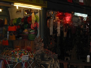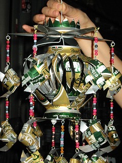 チャットチャックで買ったガラガラです。ビアチャーンの缶で造ってますね。真ん中は風が吹くとクルクル回るようになってます。値段は120バーツ。ん~ なんか高いような。もとではただなのに。技術料か?決してまけてくれません。ほんと強気なおねーさんでした。日本にどうやって持って帰ったらよいか?なんて 考えましたが結局かっちゃいました。こういうのって 買わないと後から必ず後悔しちゃうんです。二度と出会わないことも結構あります。コンビニ袋に入れて機内に持ち込み無事原型を保ち 今は店内の飾りに加わってます。