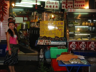 この おねーさん とても愛想がよく親切。毎回 お邪魔してます。シーフードなら お勧め ヤワラー(中華街)の 「新明財」(NEW MAN CHAI) 今夜の献立は、空しんさいの炒め物、ふかひれスープ、プーパーッポンカリー、からす貝の炒め物、海老と豚のから揚げスッパイソースいか焼き、フレッシュオイスター5個、シンハービール2本〆て 1060バーツ 約3000円です。生かき は ここのお勧めです。身が厚くプリプリしてます。二人では食べきれず、残りはテイクアウト。(かきは 全部たべました)ホテルに帰って 赤霧島のつまみになりました.