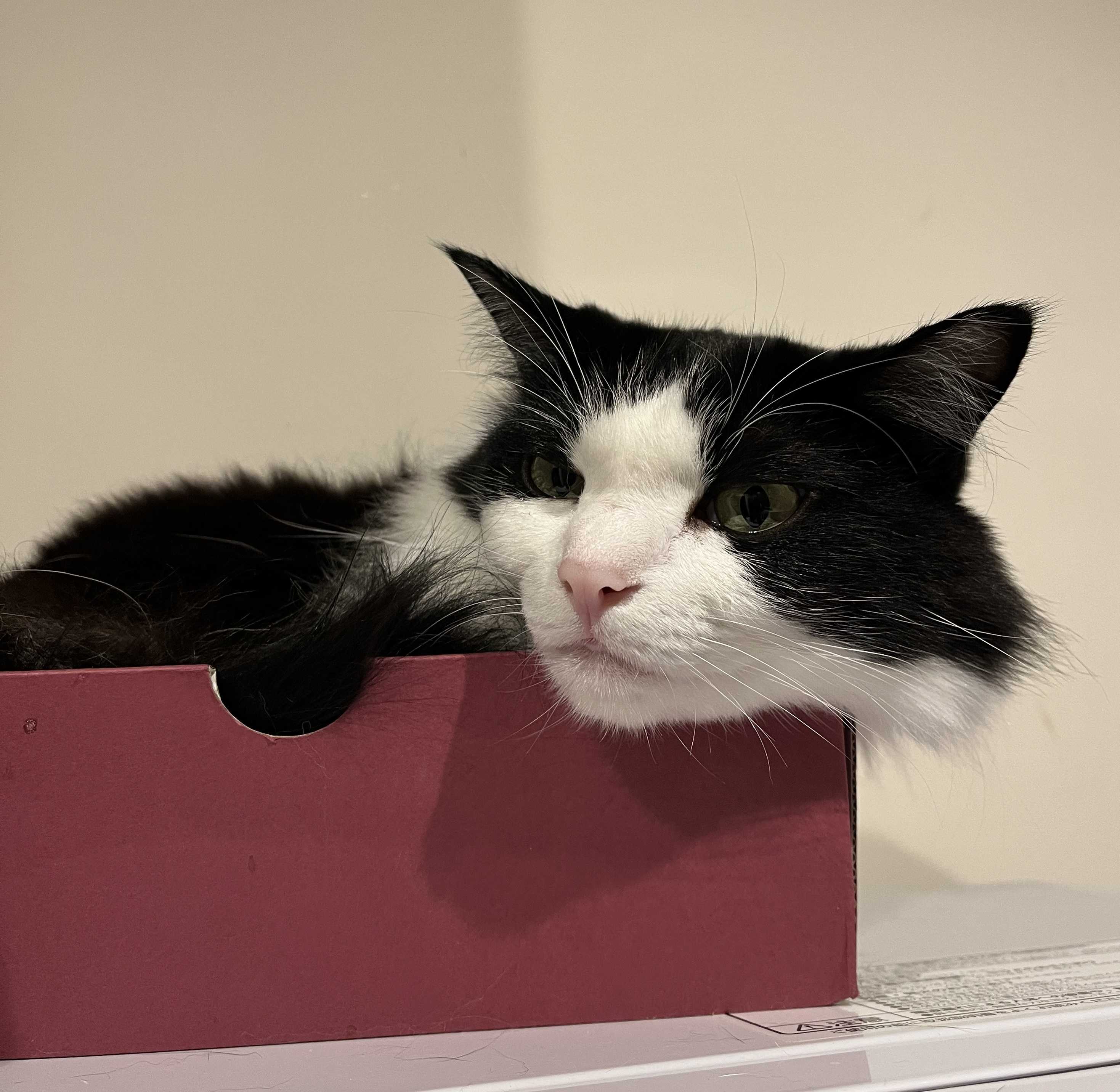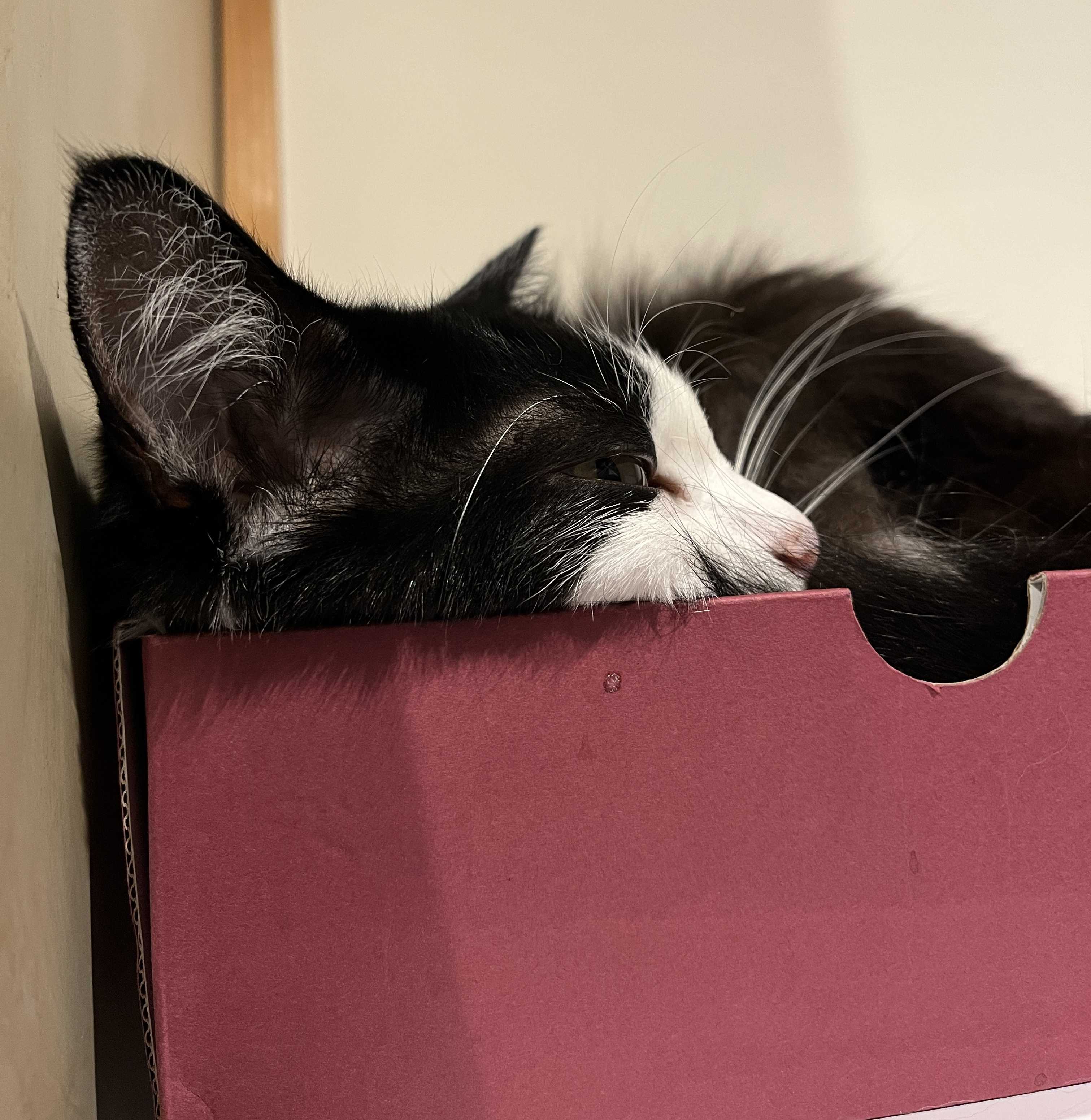 仕事も終わり、ホッと一息。ミキはいつもの箱に。ミキ専用箱だもんね。ここに入っていてくれるとネフガード飲ませるのが楽。よしよし、ミキよしよしだよ。座ってホッとしていたら右の耳がほんのりあったかくて、そーっと横目で見たらてるの肉球があたってた。ありがとう温かいよ、てる。そーっと写真を撮った。いつでも何でも記念写真。