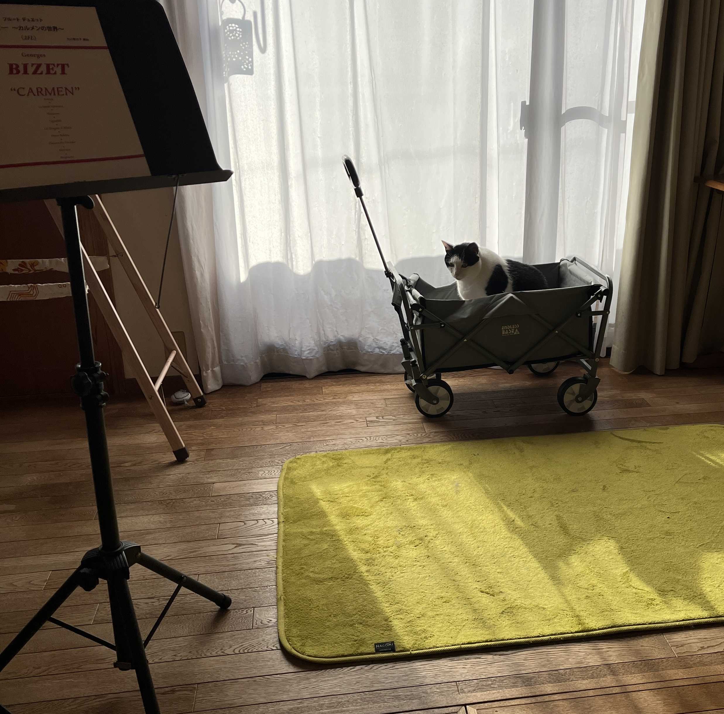 生徒がヘアバンドを作ってくれた。毛糸で編んで、私の分も。とてつもなく嬉しい。ありがとう。折角だから早速着けてレッスンをした。記念に撮っておきますよ*~(´・ω・`)~*♪編んでくれた生徒とあに。月に3度だけ使える、あに専用ベッド。あにも嬉しいね。今日の、別な生徒の時はミキも出てきて眠ってた。ミキが出てくるのは珍しいね。てるは隣の部屋のカートで爆睡。こんな風に、自宅でレッスンを始めてもう何年だろう。レッスン中も猫が普通に歩いたり、眠ったりしている。
