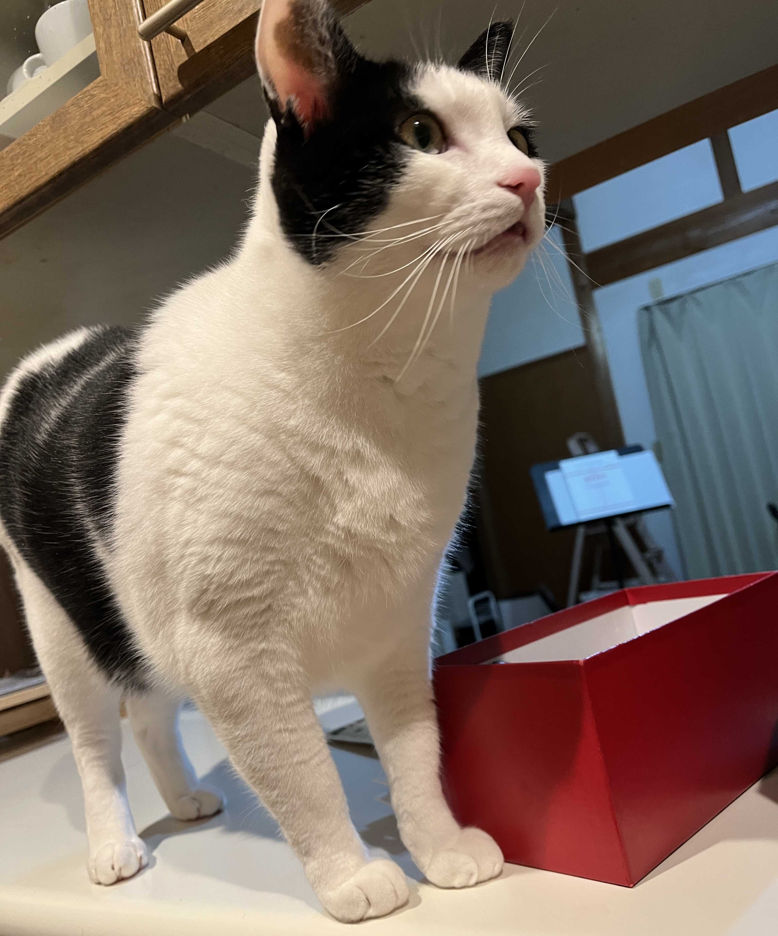 夕方、練習をしていて気がつくと横の木琴の上に、あにがいた。ありがとう、そばにいてくれて*~(´・ω・`)~*♪その後、みなさんの晩ゴハンをあげて、少ししてゆっくりのミキ。いつものお気に入り箱に。てるはここに。てるの手クニッが好き。あには一足お先にお布団へ。あに、早いね。そろそろ猫の毛、目立ってきたね、取らないと。今日も日中暑かったなあ、今もまあまあ暑い、いつ涼しくなるんだろう。秋の心地よい時間はいつ来ますか?