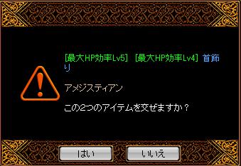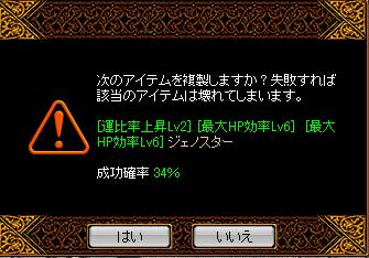 こんばんわ!ベタピンです☆^∇゜)本日は前回の最後に言ったように勝負の日です!!!今までの鏡通算成績は2勝11敗大分負け越してますが、今日のは何がなんでも欲しいのです><最近はTハードのコピーから地上の権勢など係数低いのをドロップなどベタピンつきまくり(*´ェ`*)ポッこの勢いを借りて成功か!!!はたまた運を使い切ったのかの勝負の時です。今回の鏡品こちらははじめてみた時から欲しかった手の一つです!GV考えると速度がもう1個欲しいと言えば欲しいのですが、基本GVはWIZのみ予定なのでシフのフレは気にせずにこれが狩り最終だと思っております!!いざ挑戦!!!!!!!!!!前回成功の願をかけてぐりぐりクリック!!!!!・・・また、2ヶ月がんばります・・・っていうのはうそです^-^またみなさん大嫌いな飯まずになってしまいました!!!!!いやっほおおおおおおおおおおおおおお!!!!これで剣士を知識から物理へ再振りが確定!!シフの狩りもうはうはできるに違いがないでしょう!!!!次回鏡は当分先なので次は解除のためのお金を貯めていきます(*´ェ`*)異次元しないようにがんばらんといけないですねwではノシ