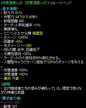 最近ブログ更新率が上がってきたベタピンです!(*´∀`*)前回作ったT速度素材からできたシフ武器を紹介しまー!!異次元高くてあんまり混ぜれないけど散財してきましたよーwまずは私が混ぜ混ぜしたのからーなぜか今回異次元の調子が良くて全部ベース残りましたwなので結果だけどんどんいきまっせーw飯まず嫌いの人はここでお帰りくださいwwwwでは結果ーはい!まずはW速度トゥルー速度足りる人はこれにダメ付けてNxして4フレがバランス的に一番いいのかな~完成系の装備lvは901ですけどww開放確定だけど確実に強くなれます!シーフは射程大事だぉ^q^続いてーT速度トゥルーはい!3フレするならこれでしょ!でも3フレ結構バランス悪いんだよね・・・でもこれで4フレにするとHP4万ぐらいまではいけますねー4万でシマー貰えば結構投げ続けられるんじゃないんでしょうか?私はこっち派ですwこれは当分の間鏡貸し予定です!鏡したい人はベタピンまで耳よろ!続きましてー狩り用W速度パイレーツこれにダメ付けてNxで漆黒もさくさくいけるんじゃないかな~?WダメパイレーツNxで漆黒で狩りしたけどダメはいいけど速度がって思って作った一品これは欲しい人がいれば鏡したり売ったりもありだと思ってます。続いてー私と同じで我慢できない病の方が作成した制限用!!速度50ブラックソーン制限用でダメ付けて投げたら結構いいんじゃないんでしょうか?これはロジャー氏曰くこれじゃー我慢ができん!!と言ってましたwこれは現在売りに出してるみたいなので購入希望者の方は本人に交渉どうぞー!続いて制限シフ最終武器!W速度ブラックソーンNxはい!これ250制限のシフだと最終なんじゃないでしょうか?これなら3フレもいけてダメもちょっと付けれる!まぁ~100バッチ必須ですけどw支援リトルさん次第ではダメも結構なとこまで付けれるのかな?制限の事よくわからんからどうなのかわからないけどwこれは売り等の予定無し!頑張ってTUEEEEEEEしてもらいましょうw作ったのはこれぐらいですねー他に私が別で持ってたT速度ブレイブ、Wダメパイレーツも一緒に露天に並べてみましたw他にシフ武器こんなの作ってとかあったらコメントお願いします!T速度素材まだまだあるので面白うそうなのあれば混ぜたいと思います!ではまたー^^ノシ