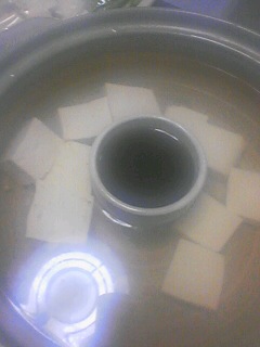 昨日夕飯で湯豆腐を食べたのだ京都の湯豆腐なんだけど知ってる?見てわかるかな?お豆腐だけ鍋の真ん中に鰹節で濃い目にオダシをとってお醤油、お塩で味をつけたたれを入れてるのこのまま炊いてお豆腐がゆらゆらしたらできあがり器に真ん中のつけだれとおねぎと七味唐辛子をお好みで入れてお豆腐を入れてお口のなかに春菊なんぞ入れてもおいしいよポン酢で食べないのが京都の湯豆腐なの。清水寺の茶店でも同じものが格安で食べれるよちなみにたれは私が作ったのだ簡単だから誰でもできるんだ