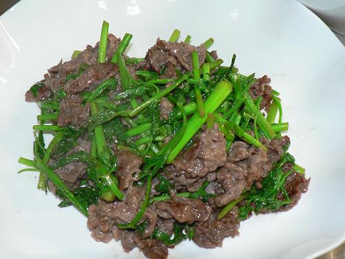 GW目前にしてこの寒さ……一体どうしたっていうんでしょ(?_?)え?そろそろ冬物のともおさらばしたいのに、なかなか思うようにはいなかいね~。20代のピッチピチのOLさんたちは、雑誌から抜け出したような春色ファッション全身白で爽やか~足元はすでに素足にパンプス~ちょっと気を付けて下さいよ身体冷やすと腰にくるゾォなーんて余計なお世話だったわねヽ(^_^;))ではこんな時間ですが昨日の晩ごはんアップします♪牛肉とセリの炒めものレンコンきんぴら、鮭茶漬け香りの強い野菜が大好きな我が家にピッタリの一品^^これも本からチョイスしました♪作り方も超簡単、牛の切り落とし肉150gに酒・胡椒・片栗粉をまぶして下味を付けます。セリ1束は5cm長さにカットしてね。フライパンにサラダ油を入れ、牛肉とニンニク(今回はチューブの)を入れて炒めます。肉が白っぽくなってきたら大さじ1のオイスターソースと醤油適量を入れ、黒胡椒も多めに入れます。最後にセリを加えてササッと炒め、ごま油を少々たらしたら完成セリは歯ごたえがある方が美味しいので炒めすぎないように^^色がきれいでしょレンコンきんぴらと鮭茶漬けは最近ずっと食べたかったもの(笑)なんだか取り合わせがバラバラね~でも美味しかったヨ