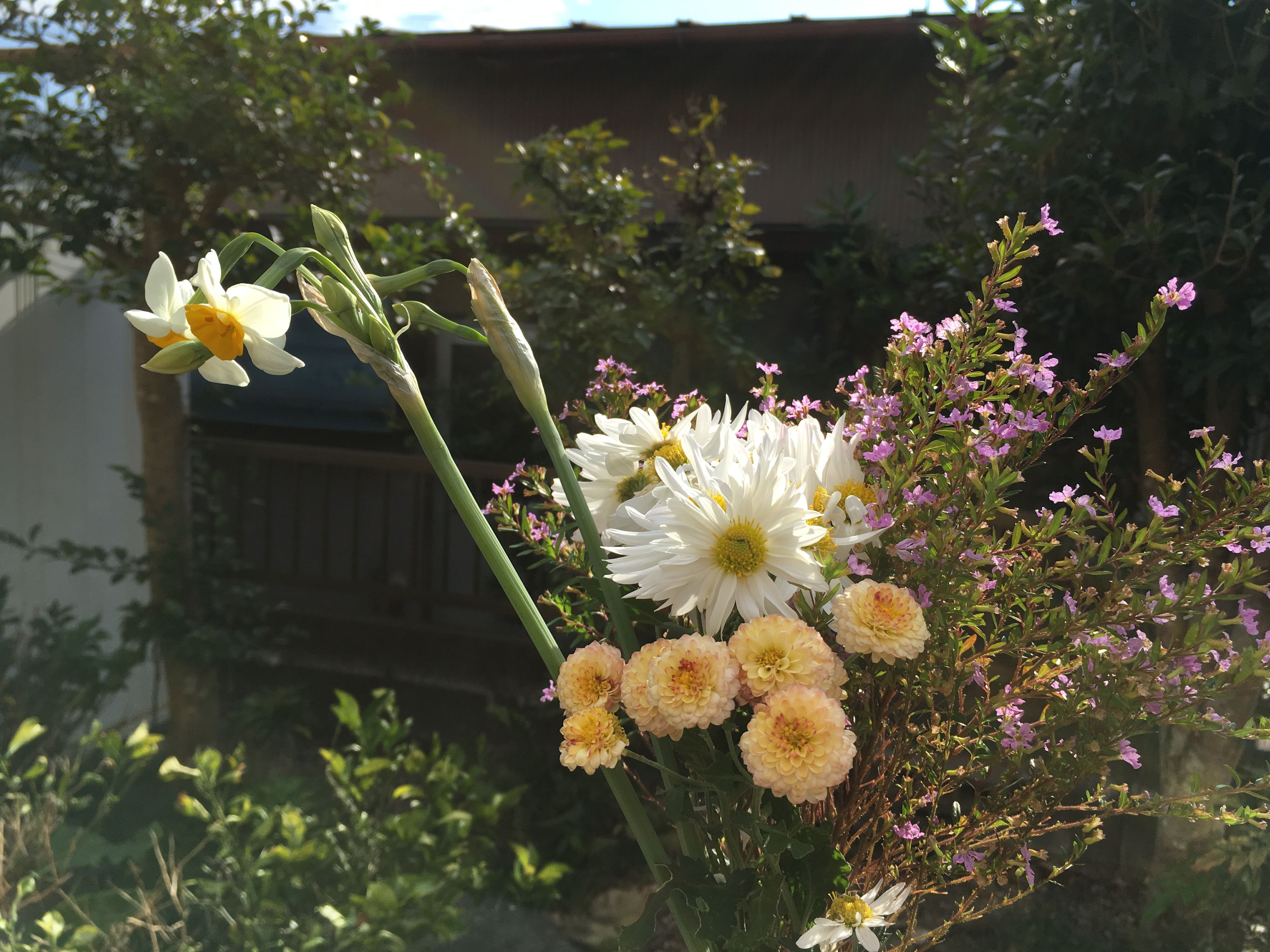 今日は庭に咲いている花を持ってお寺に行きました。